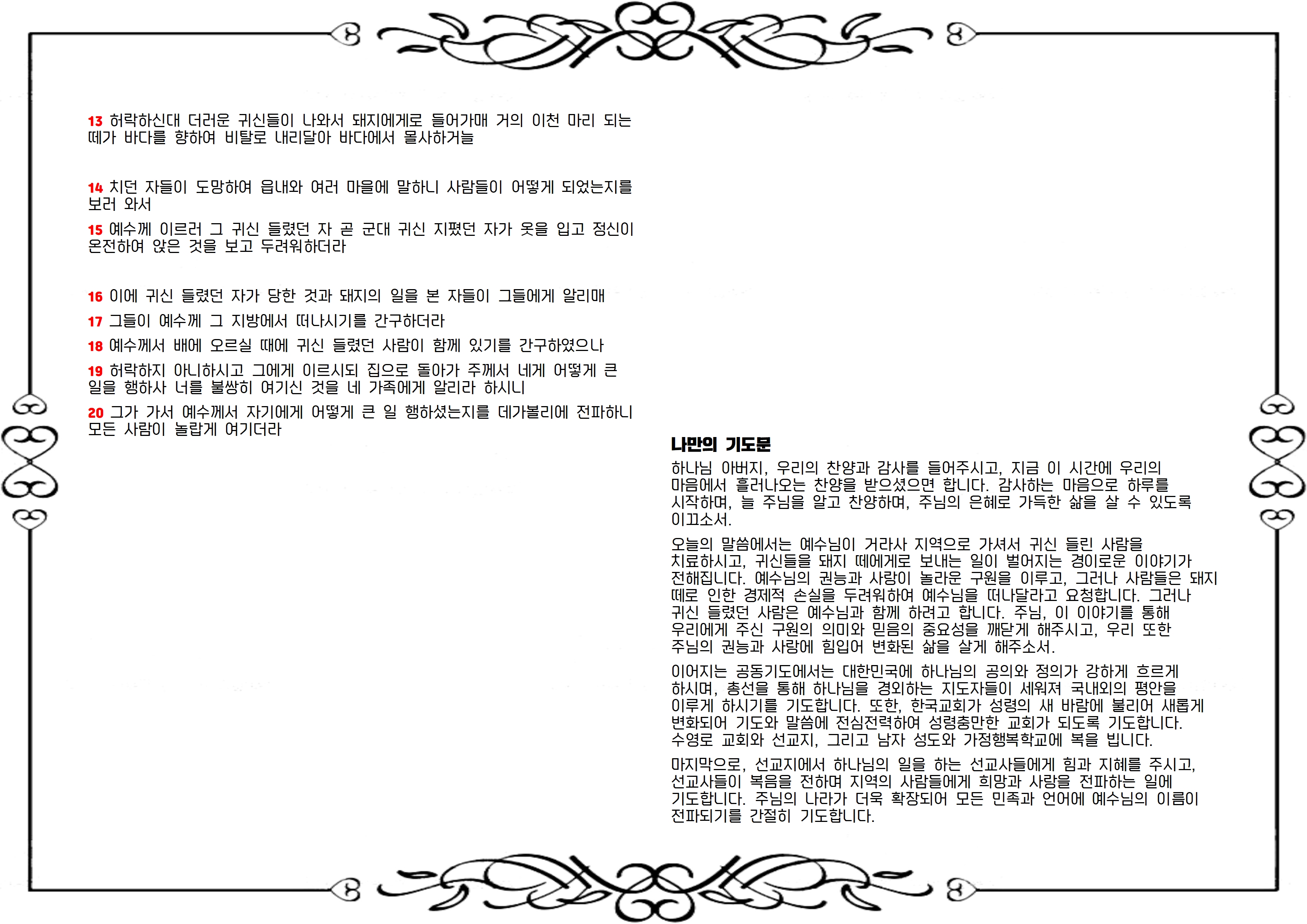 오늘의 말씀에서는 예수님이 거라사 지역으로 가셔서 귀신 들린 사람을 치료하시고, 귀신들을 돼지 떼에게로 보내는 일이 벌어지는 경이로운 이야기가 전해집니다. 예수님의 권능과 사랑이 놀라운 구원을 이루고, 그러나 사람들은 돼지 떼로 인한 경제적 손실을 두려워하여 예수님을 떠나달라고 요청합니다. 그러나 귀신 들렸던 사람은 예수님과 함께 하려고 합니다. 주님, 이 이야기를 통해 우리에게 주신 구원의 의미와 믿음의 중요성을 깨닫게 해주시고, 우리 또한 주님의 권능과 사랑에 힘입어 변화된 삶을 살게 해주소서.