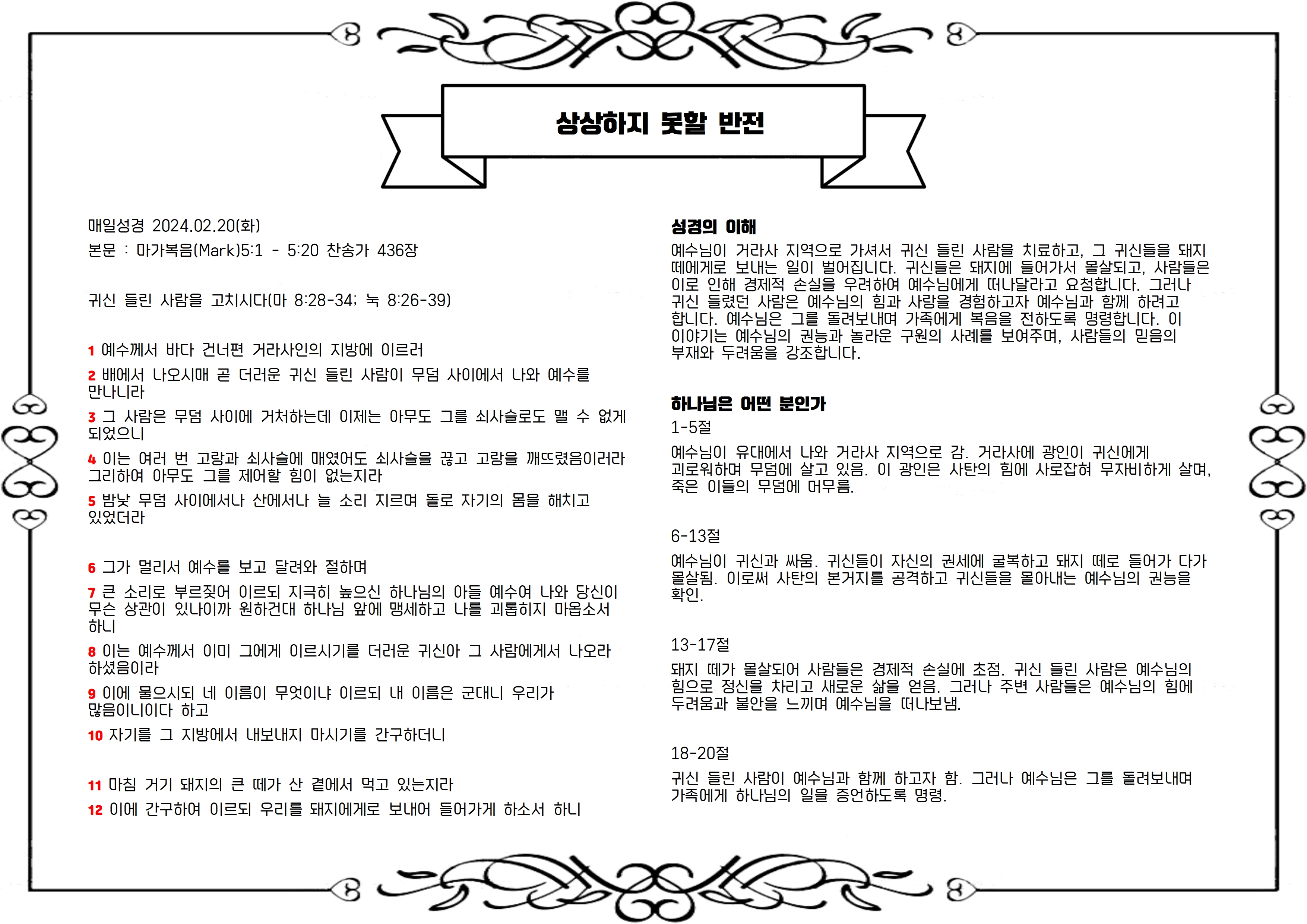 본문 : 마가복음(Mark)5:1 - 5:20 찬송가 436장