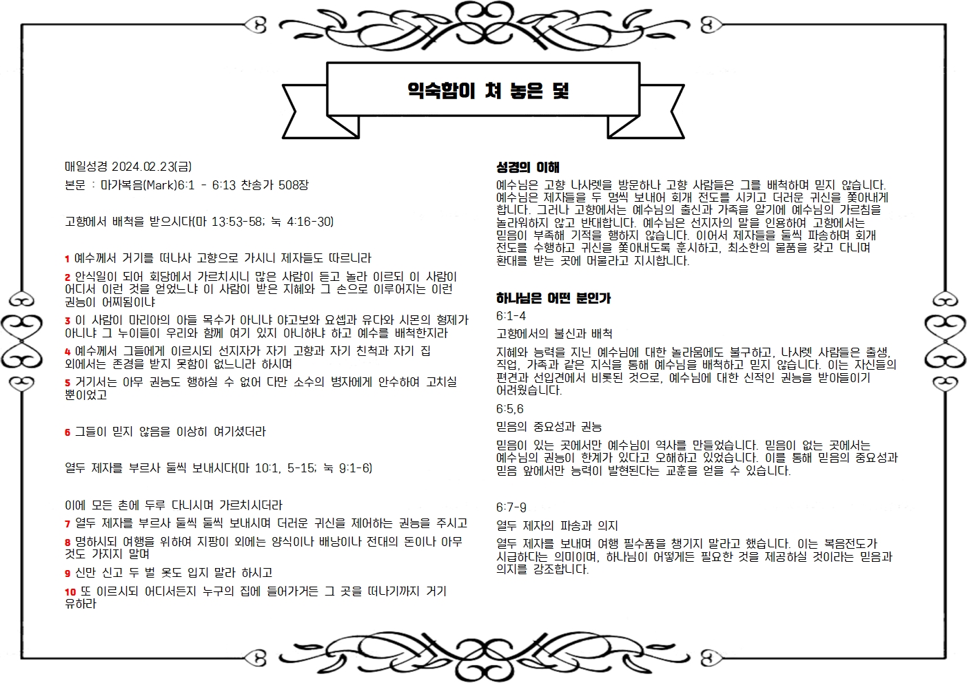 본문 : 마가복음(Mark)6:1 - 6:13 찬송가 508장