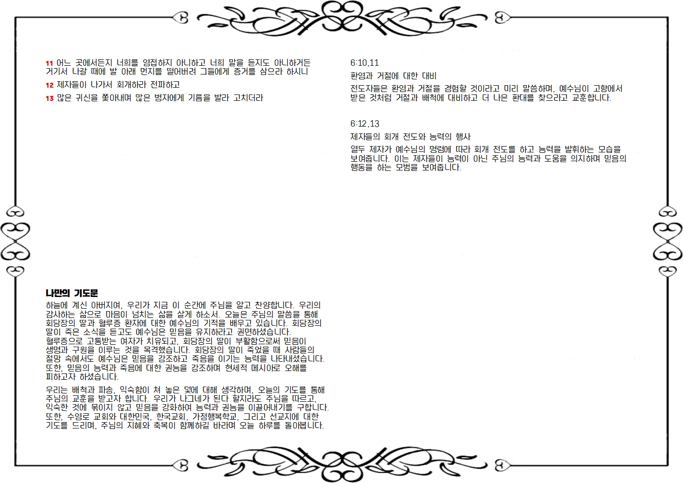 열두 제자가 예수님의 명령에 따라 회개 전도를 하고 능력을 발휘하는 모습을 보여줍니다. 이는 제자들이 능력이 아닌 주님의 능력과 도움을 의지하며 믿음의 행동을 하는 모범을 보여줍니다.