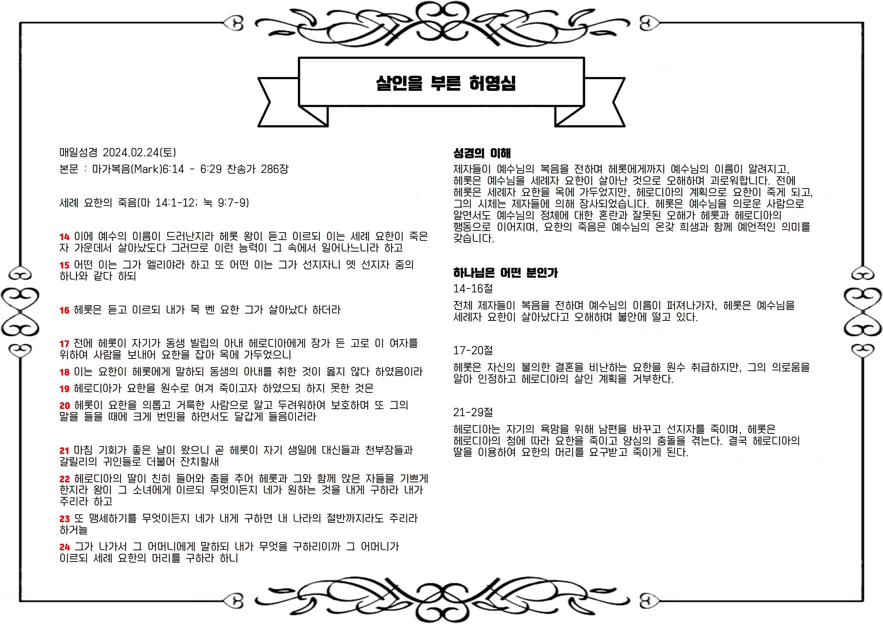 본문 : 마가복음(Mark)6:14 - 6:29 찬송가 286장