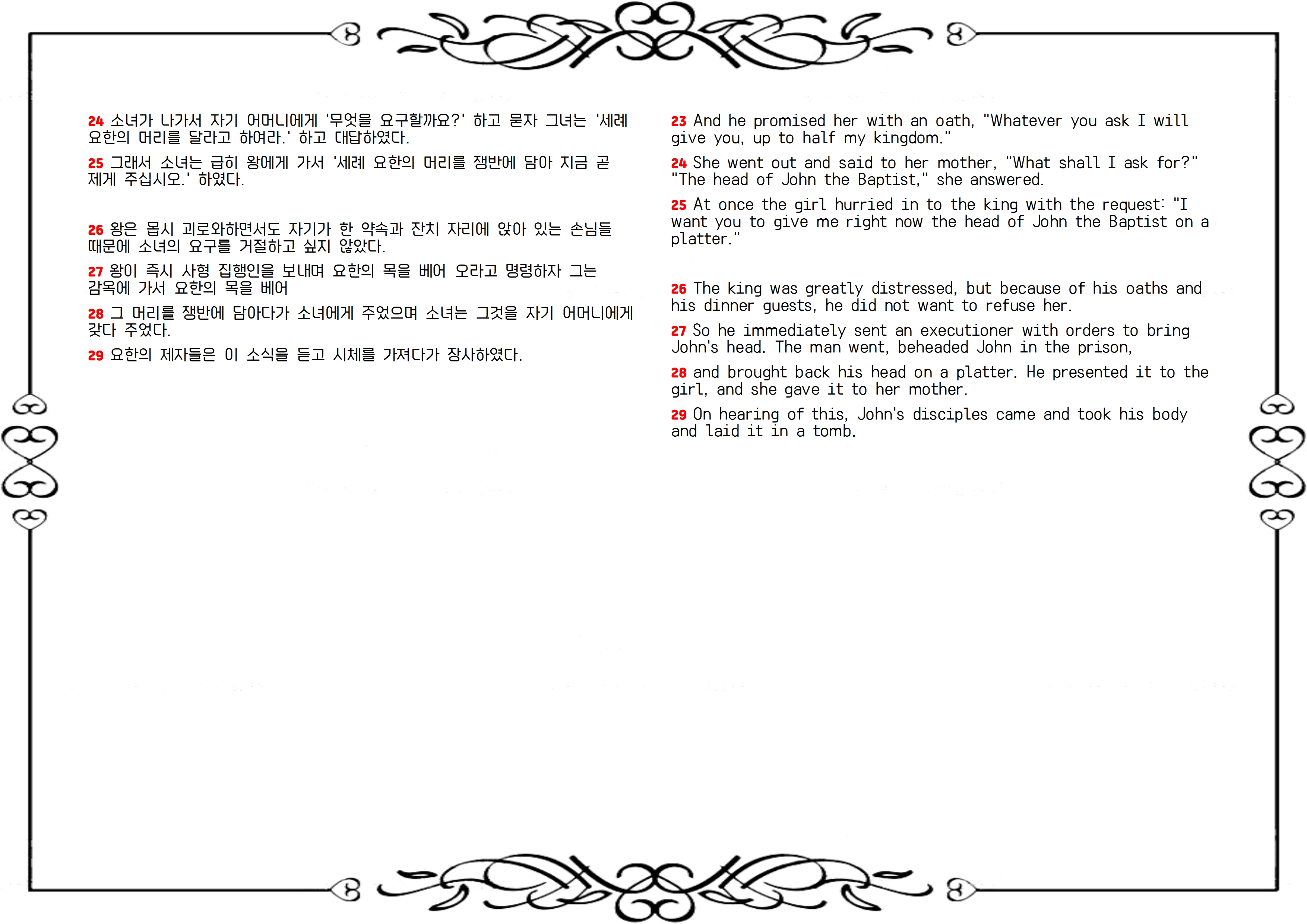 24 소녀가 나가서 자기 어머니에게 '무엇을 요구할까요?' 하고 묻자 그녀는 '세례 요한의 머리를 달라고 하여라.' 하고 대답하였다.