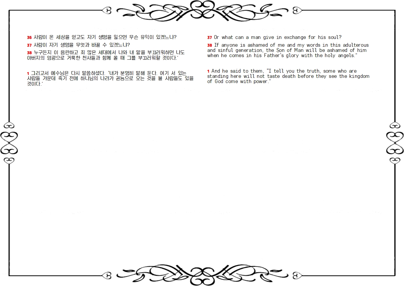 38 누구든지 이 음란하고 죄 많은 세대에서 나와 내 말을 부끄러워하면 인자도 아버지의 영광으로 거룩한 천사들과 함께 올 때에 그 사람을 부끄러워하리라