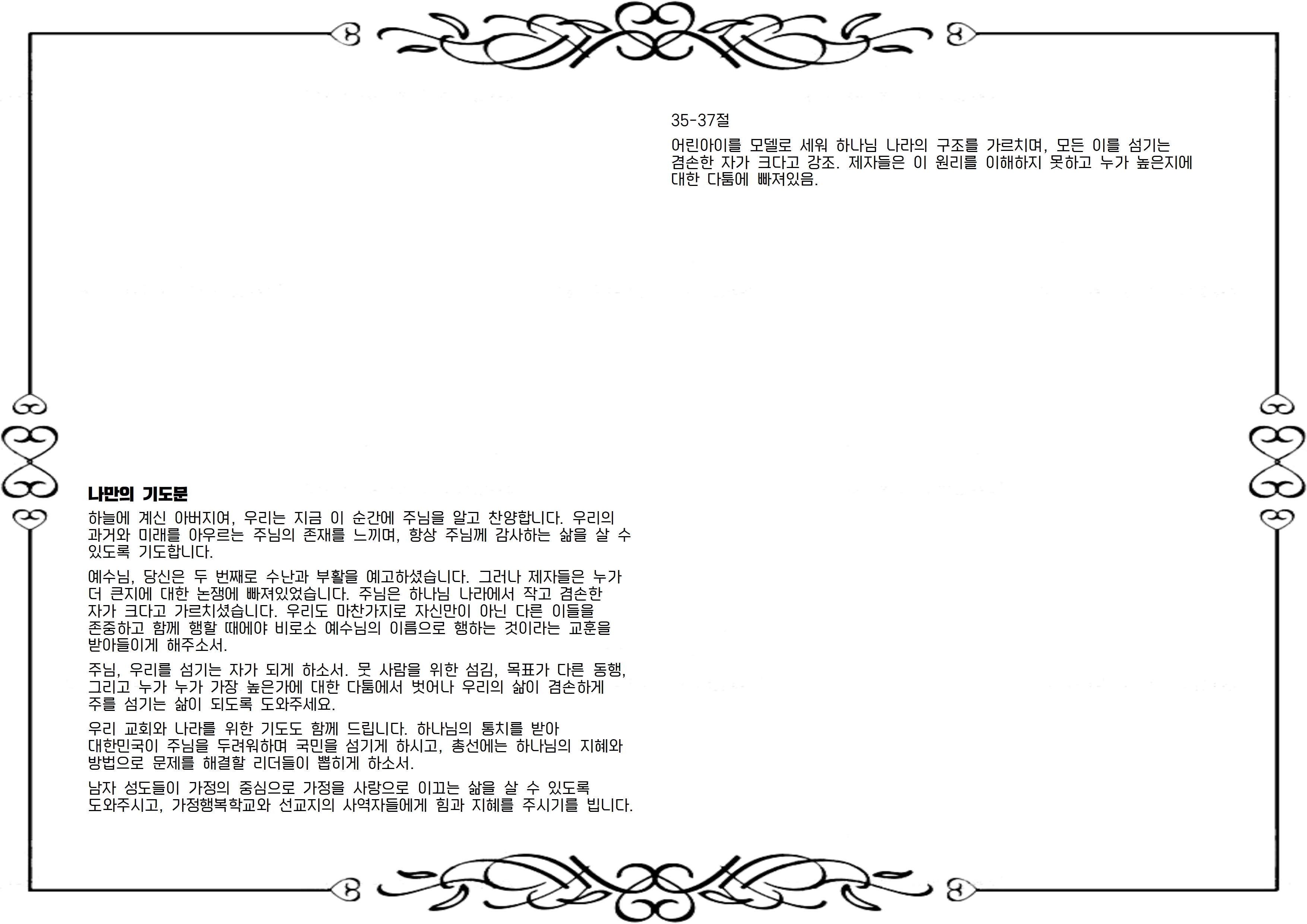 우리 교회와 나라를 위한 기도도 함께 드립니다. 하나님의 통치를 받아 대한민국이 주님을 두려워하며 국민을 섬기게 하시고, 총선에는 하나님의 지혜와 방법으로 문제를 해결할 리더들이 뽑히게 하소서.