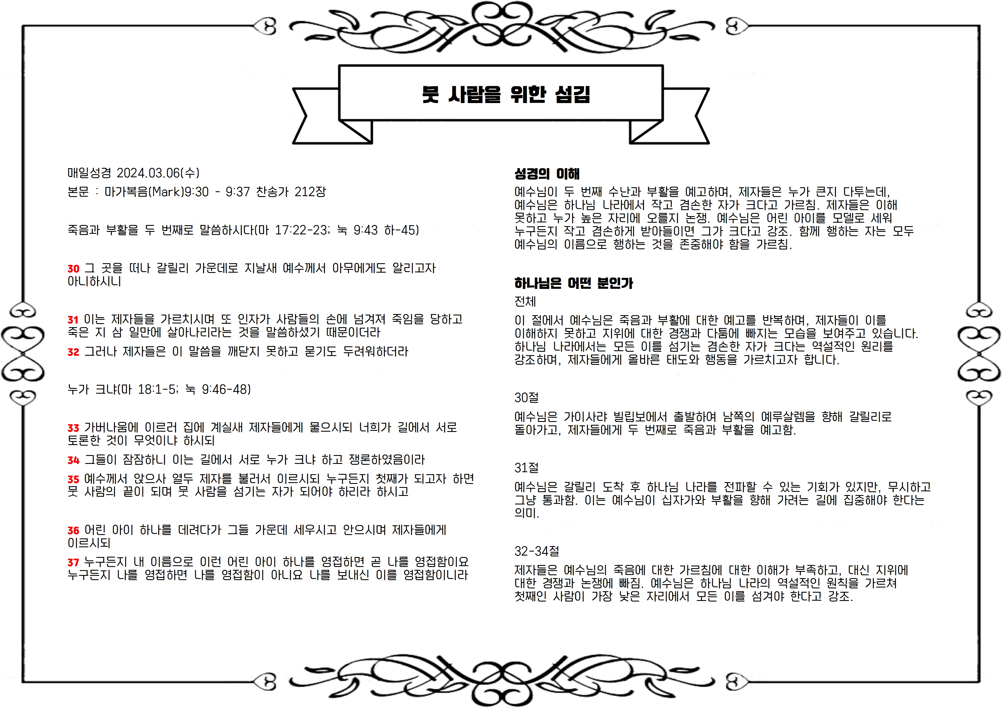 이 절에서 예수님은 죽음과 부활에 대한 예고를 반복하며, 제자들이 이를 이해하지 못하고 지위에 대한 경쟁과 다툼에 빠지는 모습을 보여주고 있습니다. 하나님 나라에서는 모든 이를 섬기는 겸손한 자가 크다는 역설적인 원리를 강조하며, 제자들에게 올바른 태도와 행동을 가르치고자 합니다.
