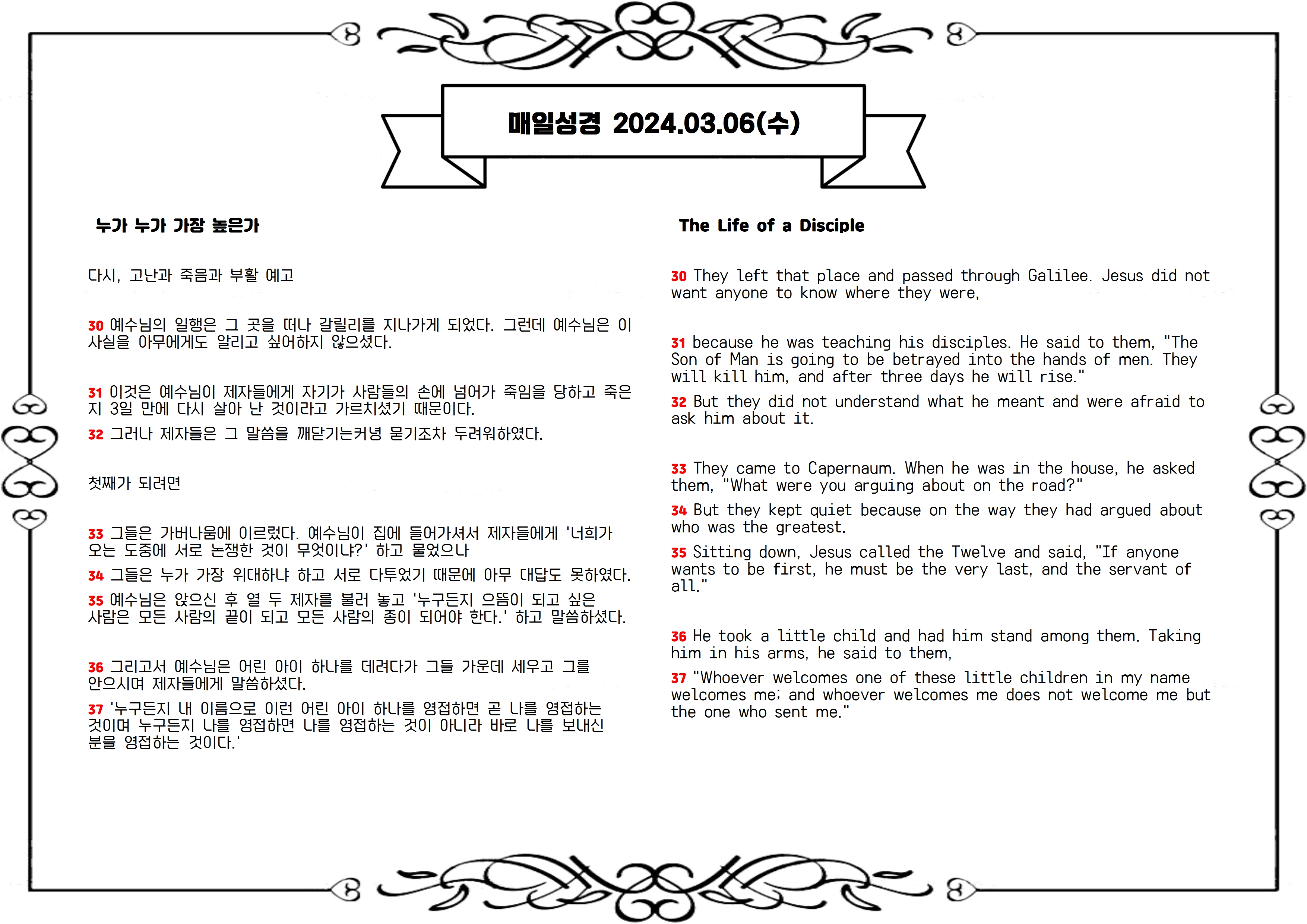 예수님이 두 번째 수난과 부활을 예고하며, 제자들은 누가 큰지 다투는데, 예수님은 하나님 나라에서 작고 겸손한 자가 크다고 가르침. 제자들은 이해 못하고 누가 높은 자리에 오를지 논쟁. 예수님은 어린 아이를 모델로 세워 누구든지 작고 겸손하게 받아들이면 그가 크다고 강조. 함께 행하는 자는 모두 예수님의 이름으로 행하는 것을 존중해야 함을 가르침.