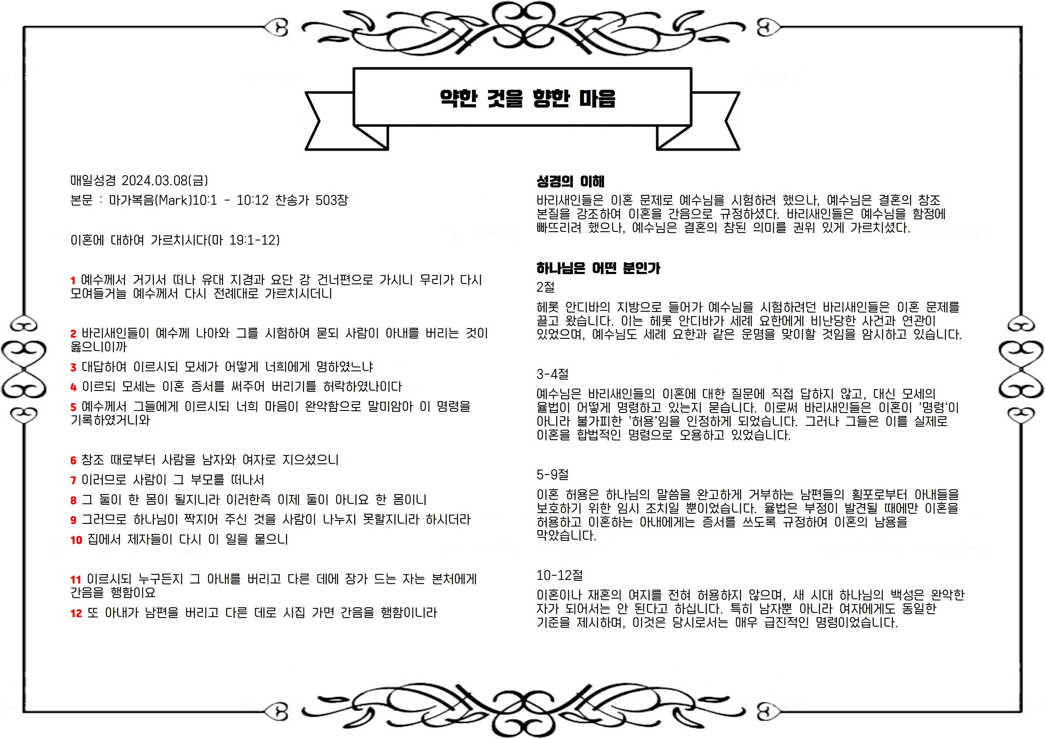 본문 : 마가복음(Mark)10:1 - 10:12 찬송가 503장