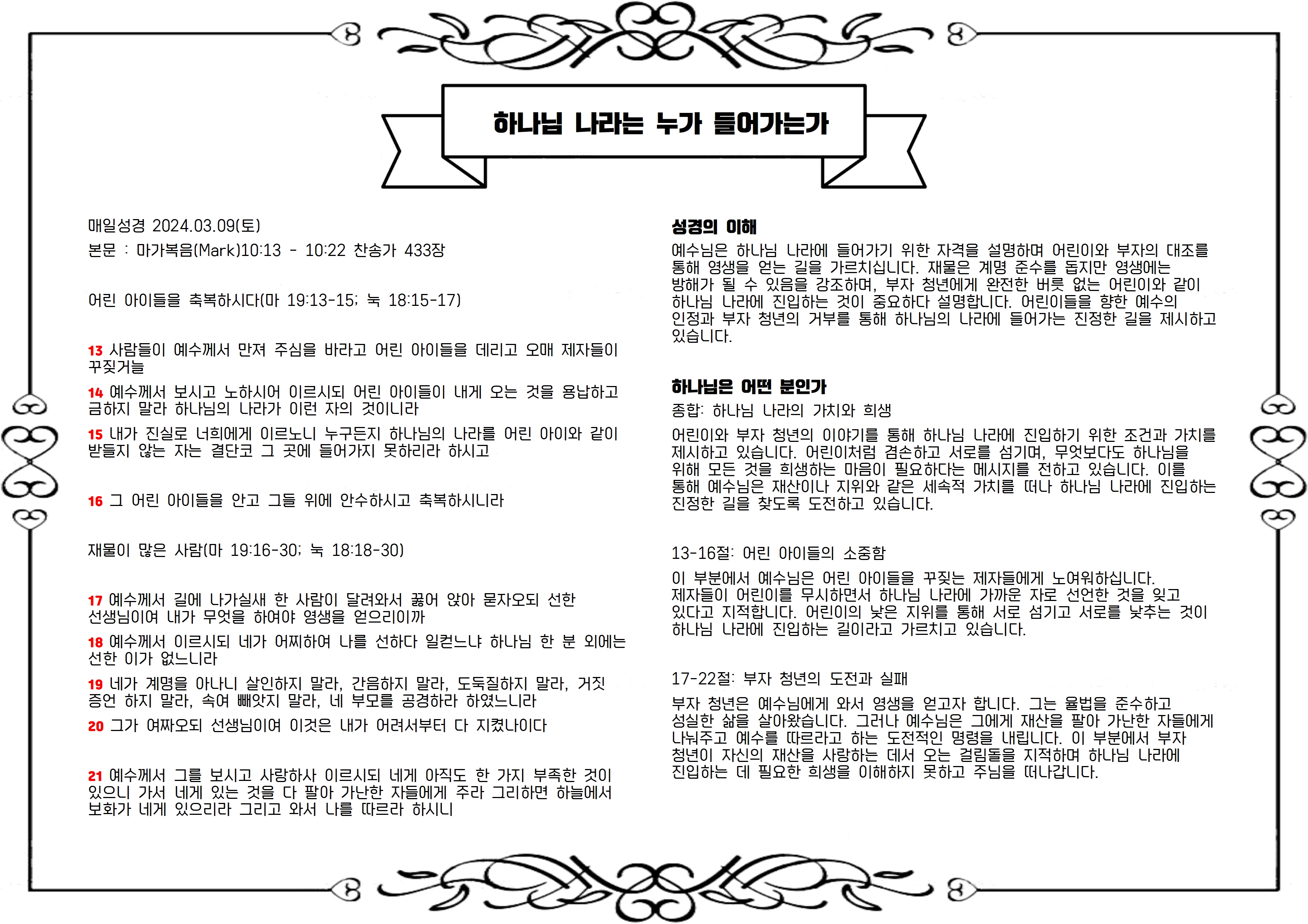 본문 : 마가복음(Mark)10:13 - 10:22 찬송가 433장
