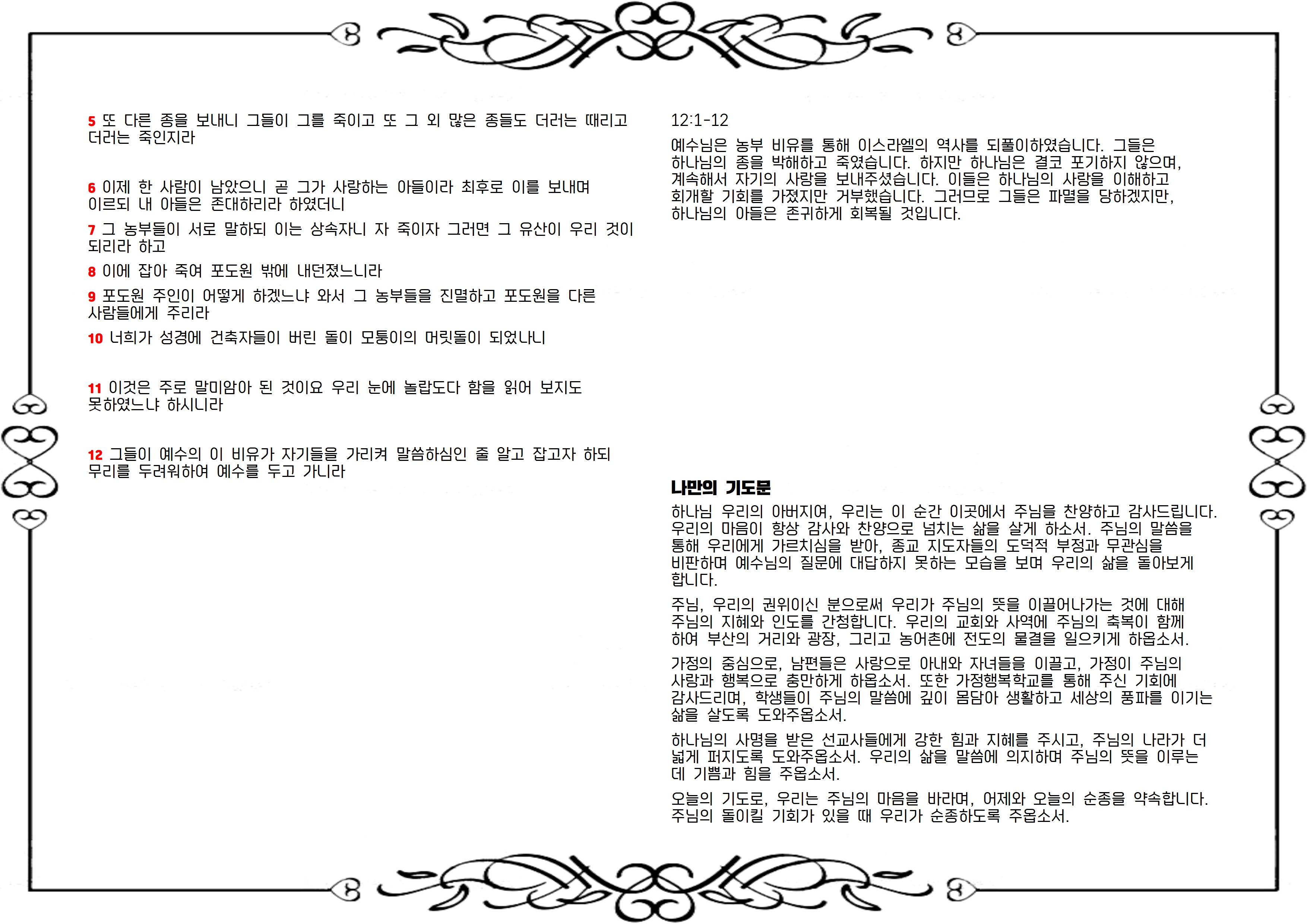1 예수께서 비유로 그들에게 말씀하시되 한 사람이 포도원을 만들어 산울타리로 두르고 즙 짜는 틀을 만들고 망대를 지어서 농부들에게 세로 주고 타국에 갔더니