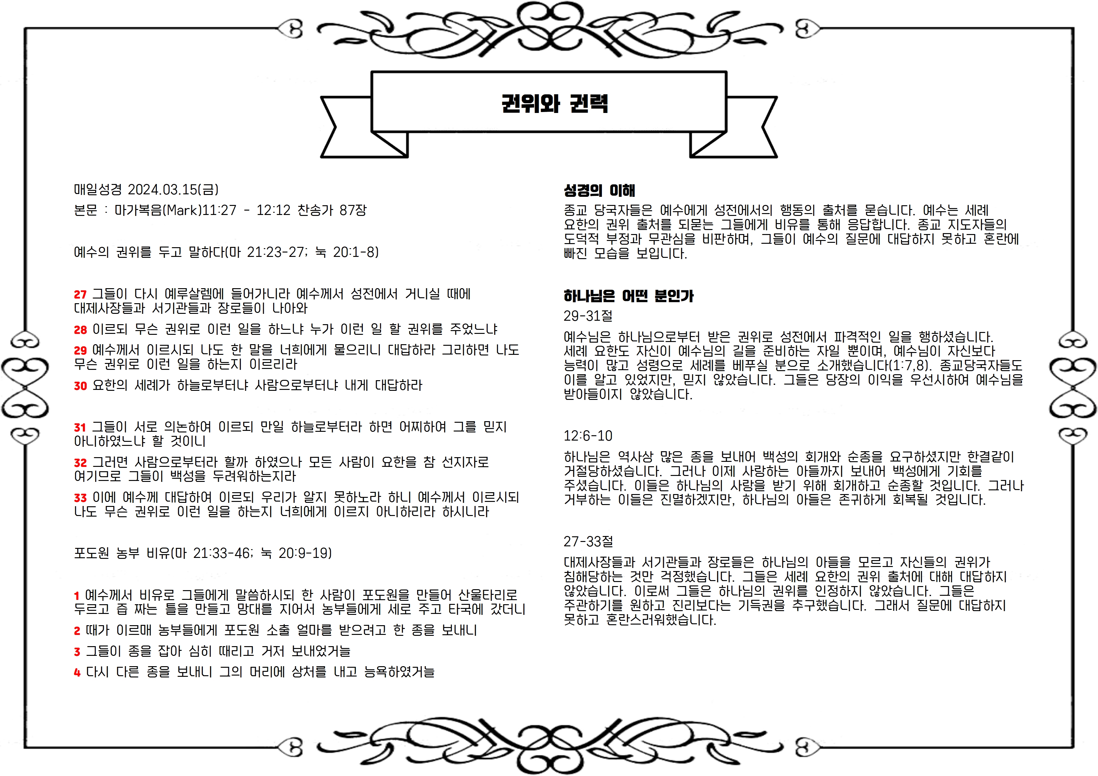 본문 : 마가복음(Mark)11:27 - 12:12 찬송가 87장