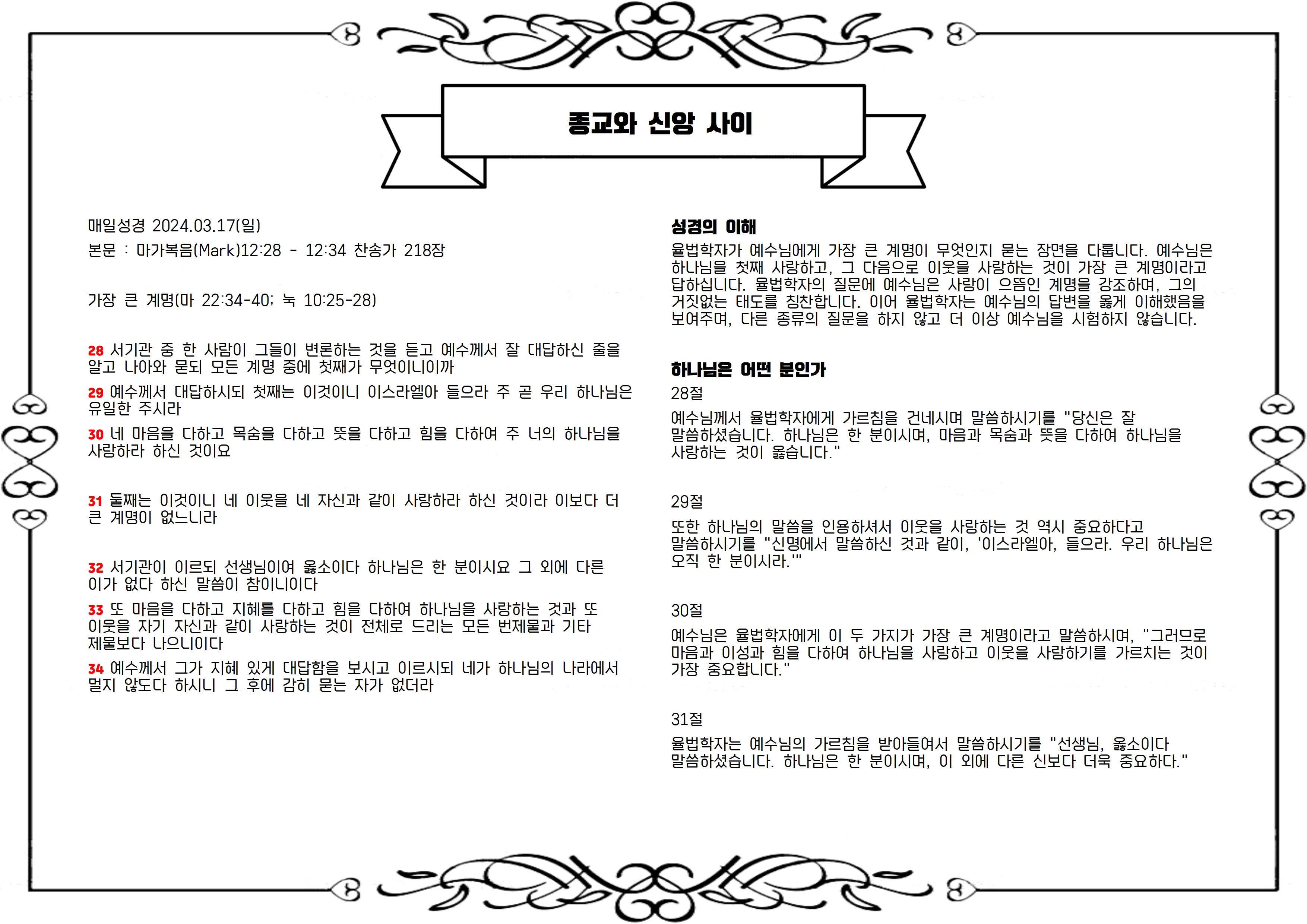 율법학자가 예수님에게 가장 큰 계명이 무엇인지 묻는 장면을 다룹니다. 예수님은 하나님을 첫째 사랑하고, 그 다음으로 이웃을 사랑하는 것이 가장 큰 계명이라고 답하십니다. 율법학자의 질문에 예수님은 사랑이 으뜸인 계명을 강조하며, 그의 거짓없는 태도를 칭찬합니다. 이어 율법학자는 예수님의 답변을 옳게 이해했음을 보여주며, 다른 종류의 질문을 하지 않고 더 이상 예수님을 시험하지 않습니다.