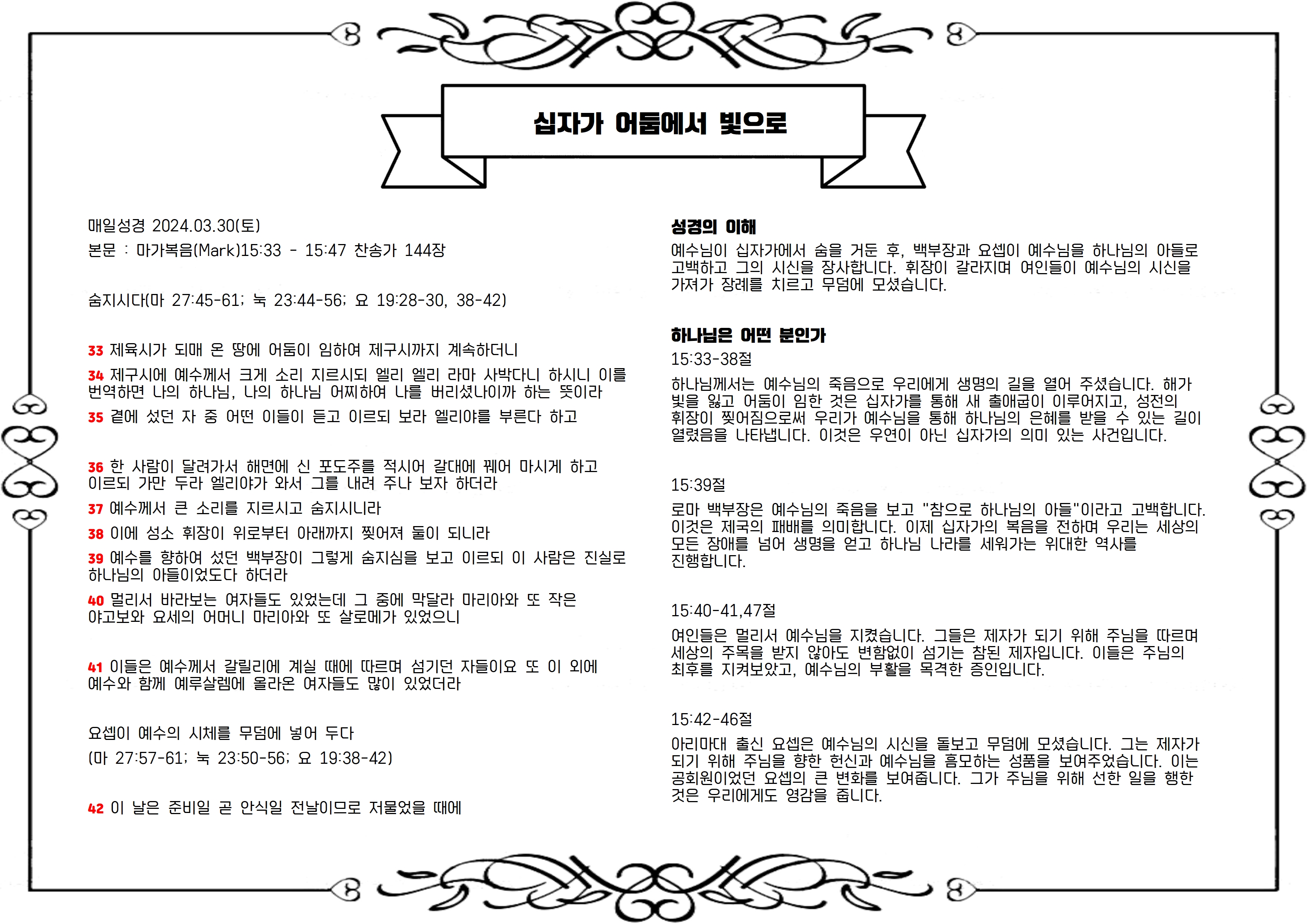 본문 : 마가복음(Mark)15:33 - 15:47 찬송가 144장