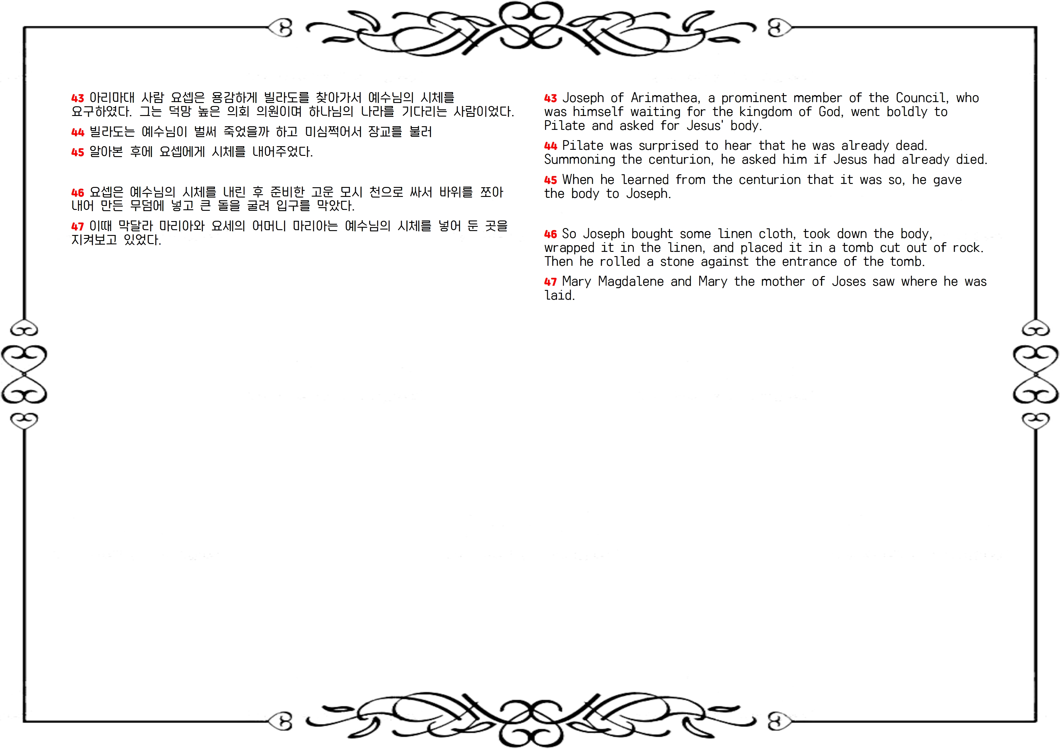44 빌라도는 예수님이 벌써 죽었을까 하고 미심쩍어서 장교를 불러