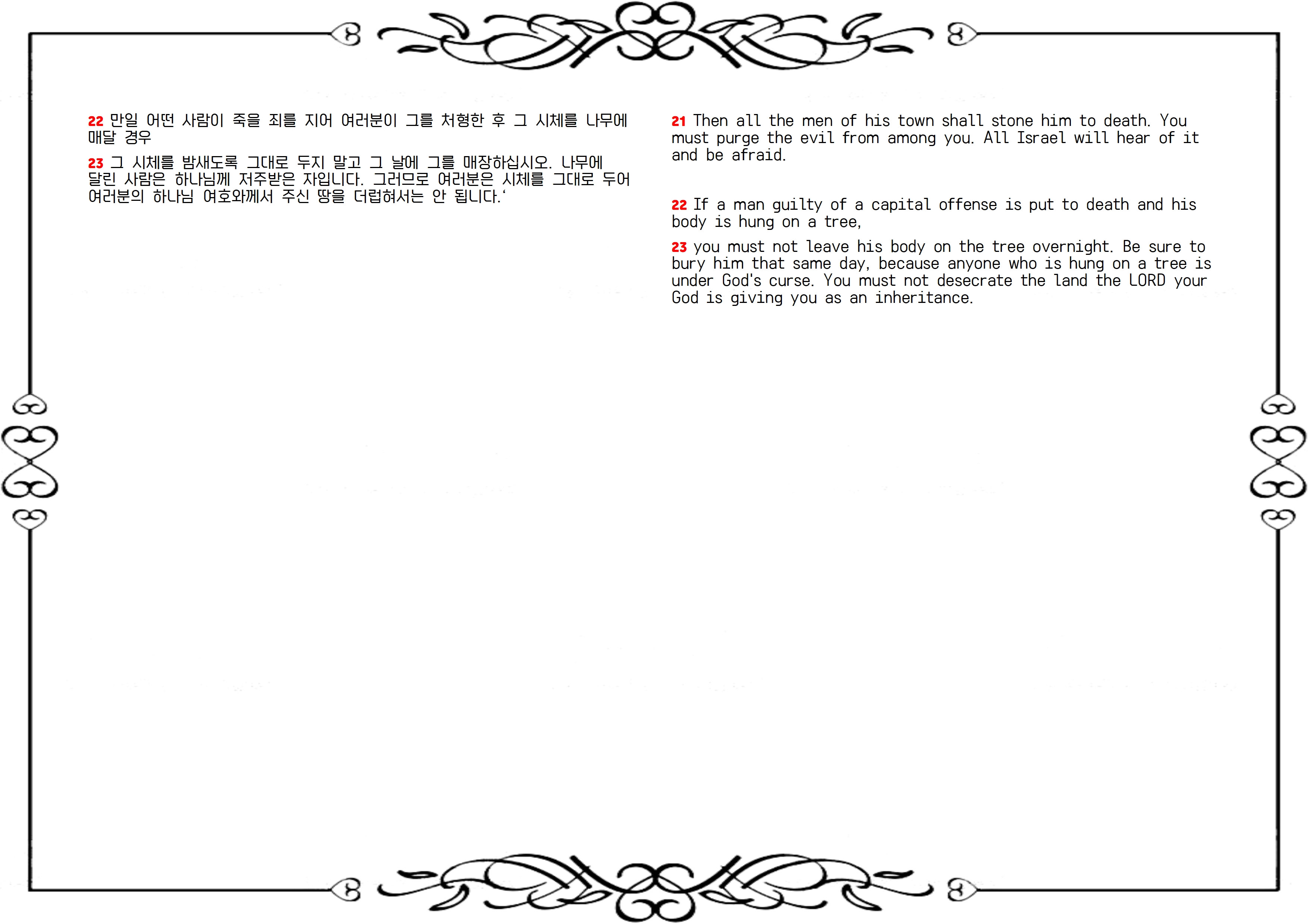 23 그 시체를 밤새도록 그대로 두지 말고 그 날에 그를 매장하십시오. 나무에 달린 사람은 하나님께 저주받은 자입니다. 그러므로 여러분은 시체를 그대로 두어 여러분의 하나님 여호와께서 주신 땅을 더럽혀서는 안 됩니다.‘
