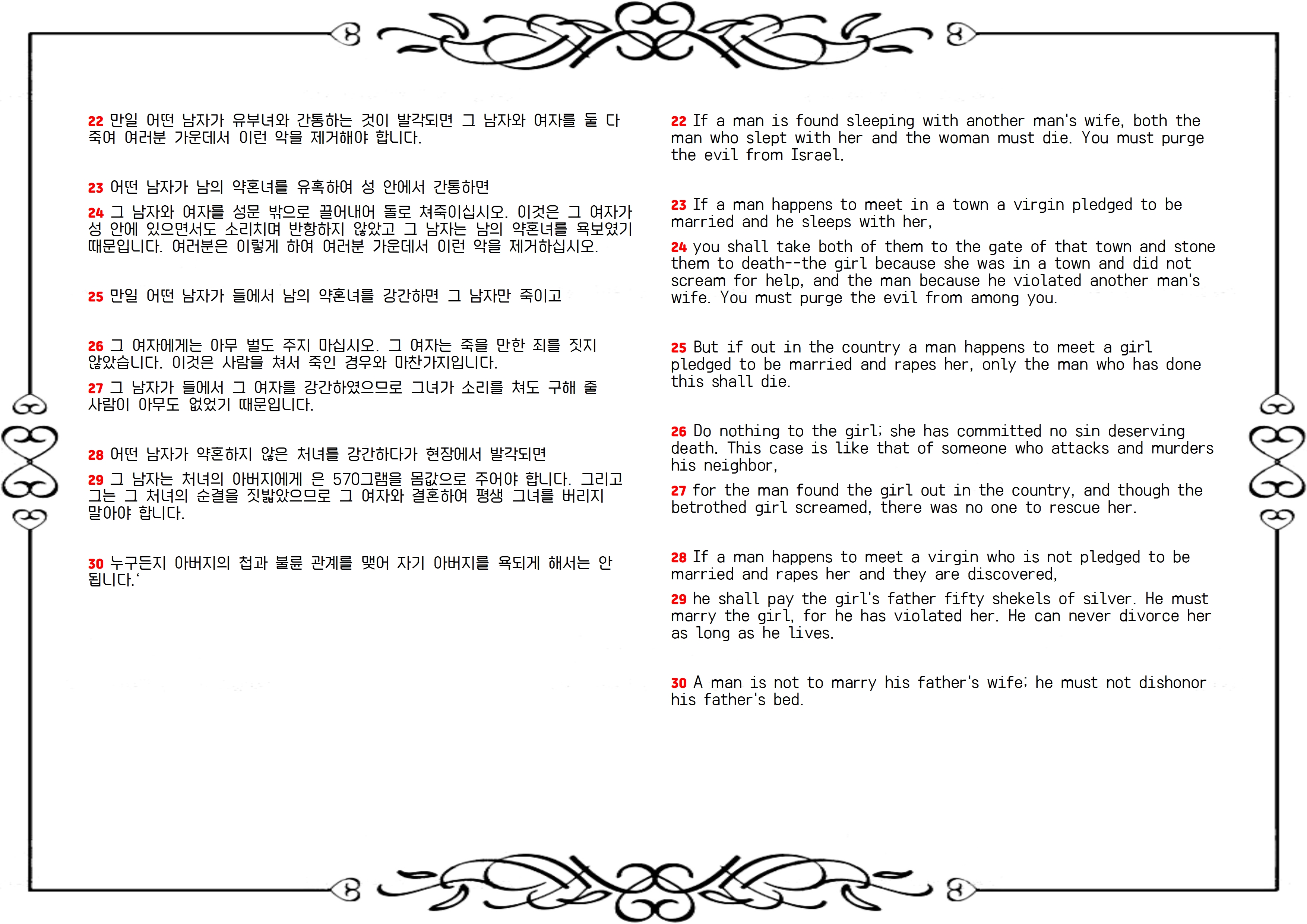 22 어떤 남자가 유부녀와 동침한 것이 드러나거든 그 동침한 남자와 그 여자를 둘 다 죽여 이스라엘 중에 악을 제할지니라