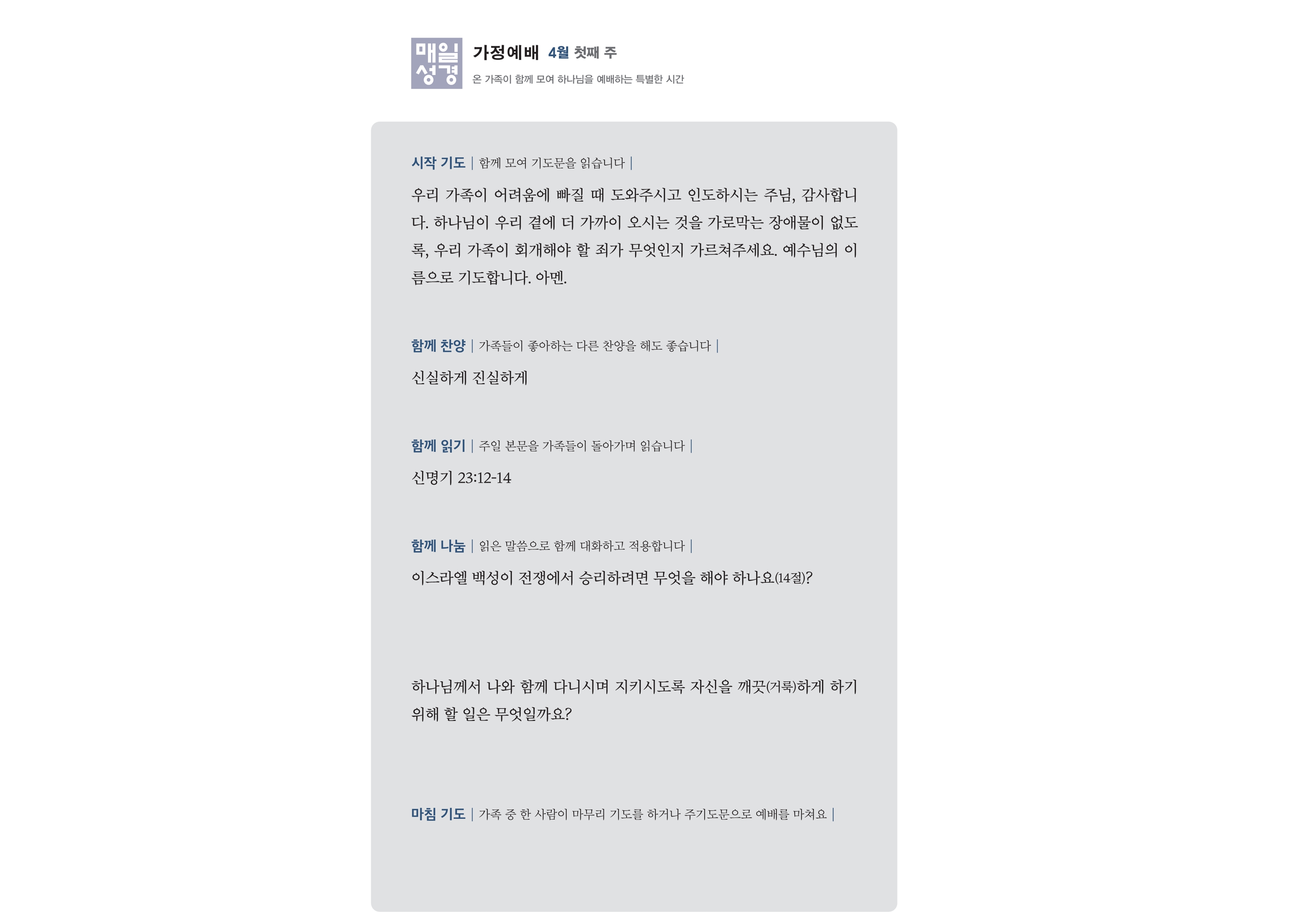 하나님, 우리의 가정이 주님을 중심으로 세워지고 사랑으로 이끌려 가는 가정이 되도록 도와주소서. 부부와 자녀들이 주님을 존경하며 서로를 사랑하는 가정이 되도록 인도하여 주시고, 가족 간의 화목과 풍요를 선물하여 주시옵소서.