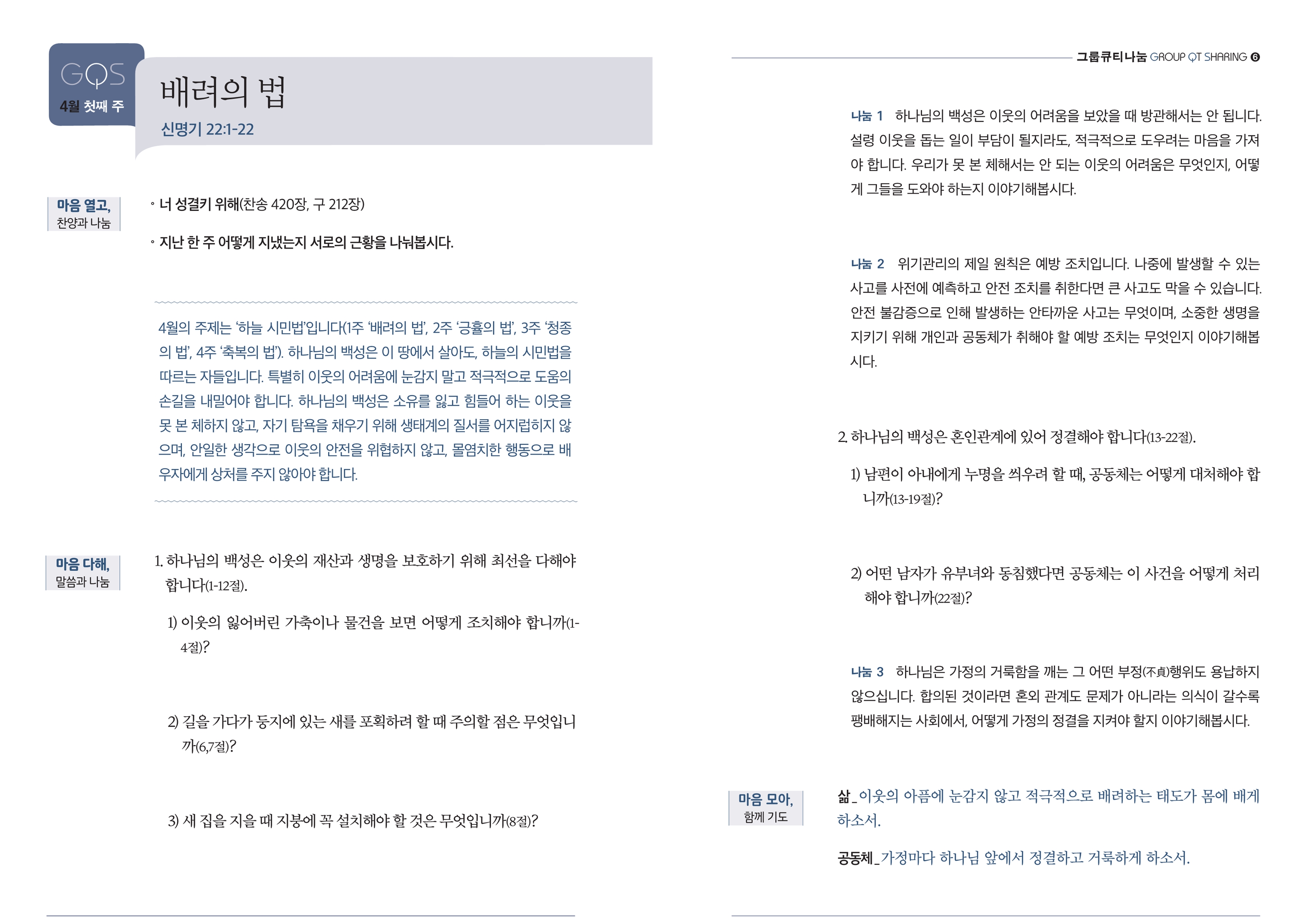 예배 공동체는 거룩해야 하며, 고자와 사생자, 암몬 및 모압 사람들은 참여할 수 없다. 이것은 하나님의 거룩함을 유지하기 위한 것이다.