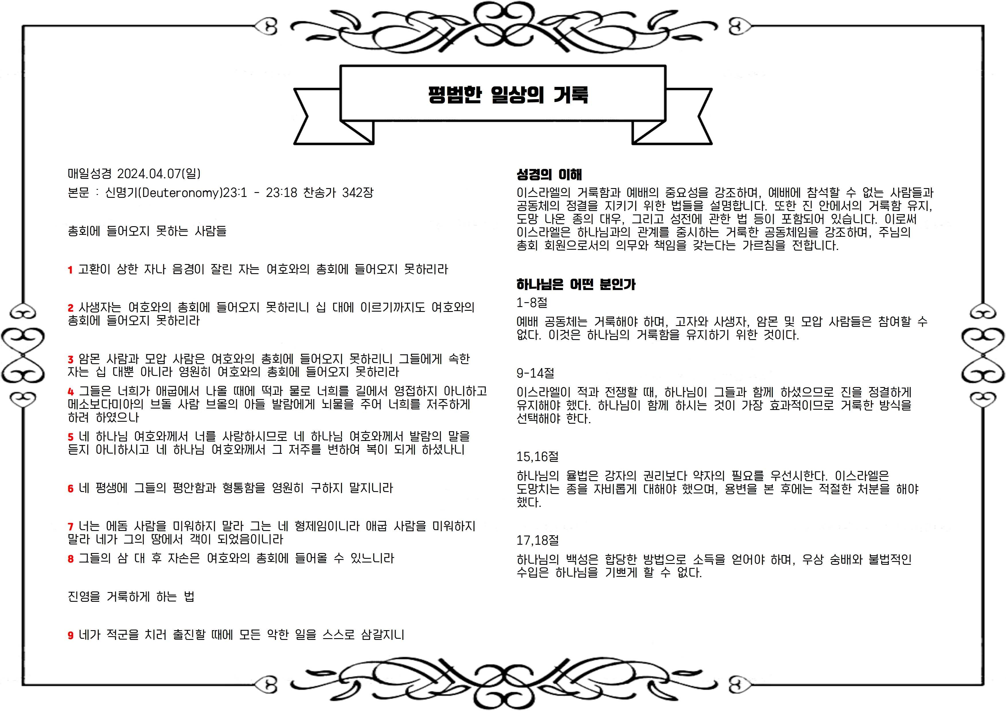 본문 : 신명기(Deuteronomy)23:1 - 23:18 찬송가 342장