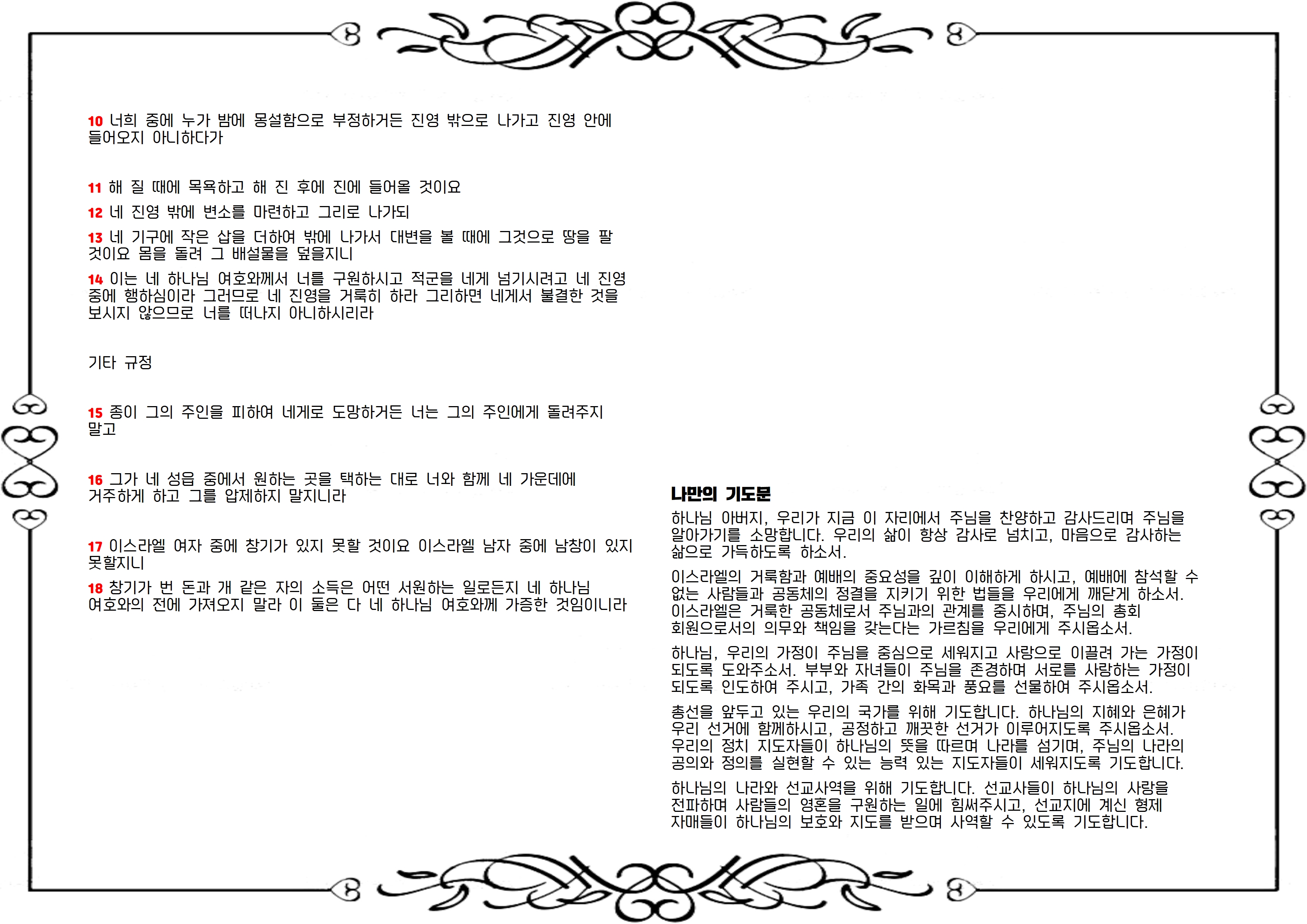 이스라엘의 거룩함과 예배의 중요성을 강조하며, 예배에 참석할 수 없는 사람들과 공동체의 정결을 지키기 위한 법들을 설명합니다. 또한 진 안에서의 거룩함 유지, 도망 나온 종의 대우, 그리고 성전에 관한 법 등이 포함되어 있습니다. 이로써 이스라엘은 하나님과의 관계를 중시하는 거룩한 공동체임을 강조하며, 주님의 총회 회원으로서의 의무와 책임을 갖는다는 가르침을 전합니다.