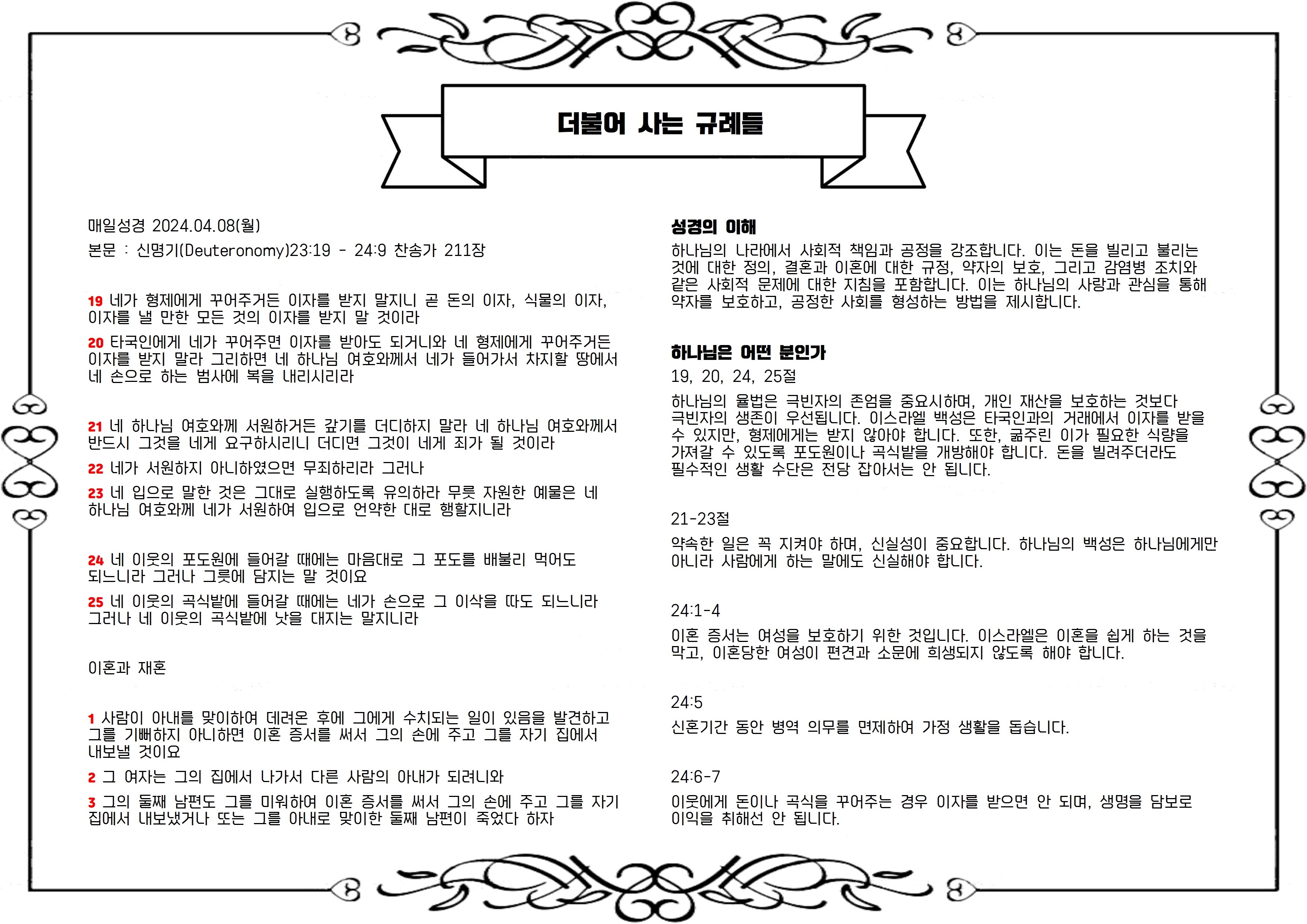 본문 : 신명기(Deuteronomy)23:19 - 24:9 찬송가 211장