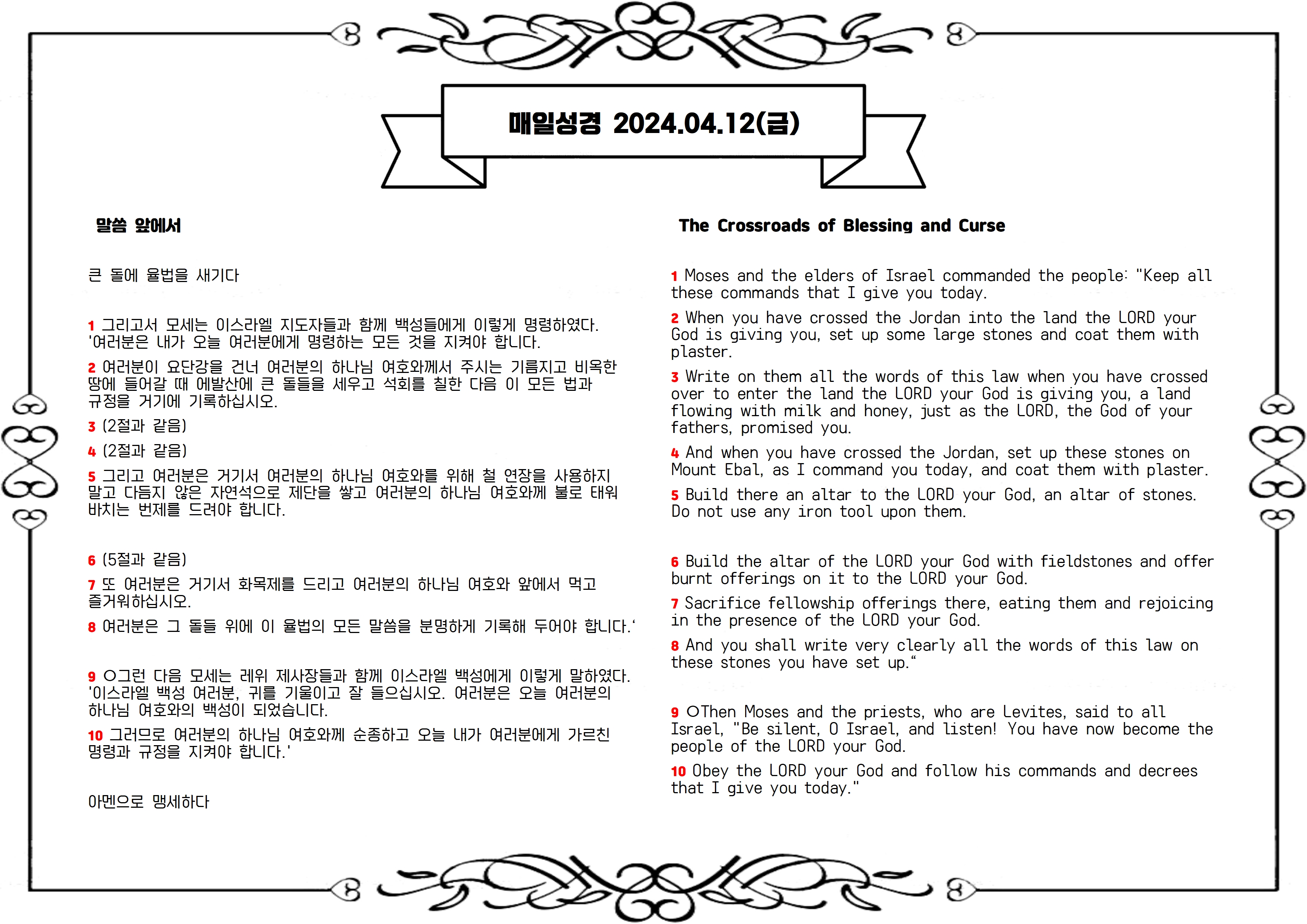 가나안 땅에 들어간 이스라엘 백성처럼 우리도 하나님과 맺은 언약을 갱신하고, 율법을 돌에 새기며 번제를 드리는 마음으로 매일 말씀을 읽고 묵상하게 하옵소서.
