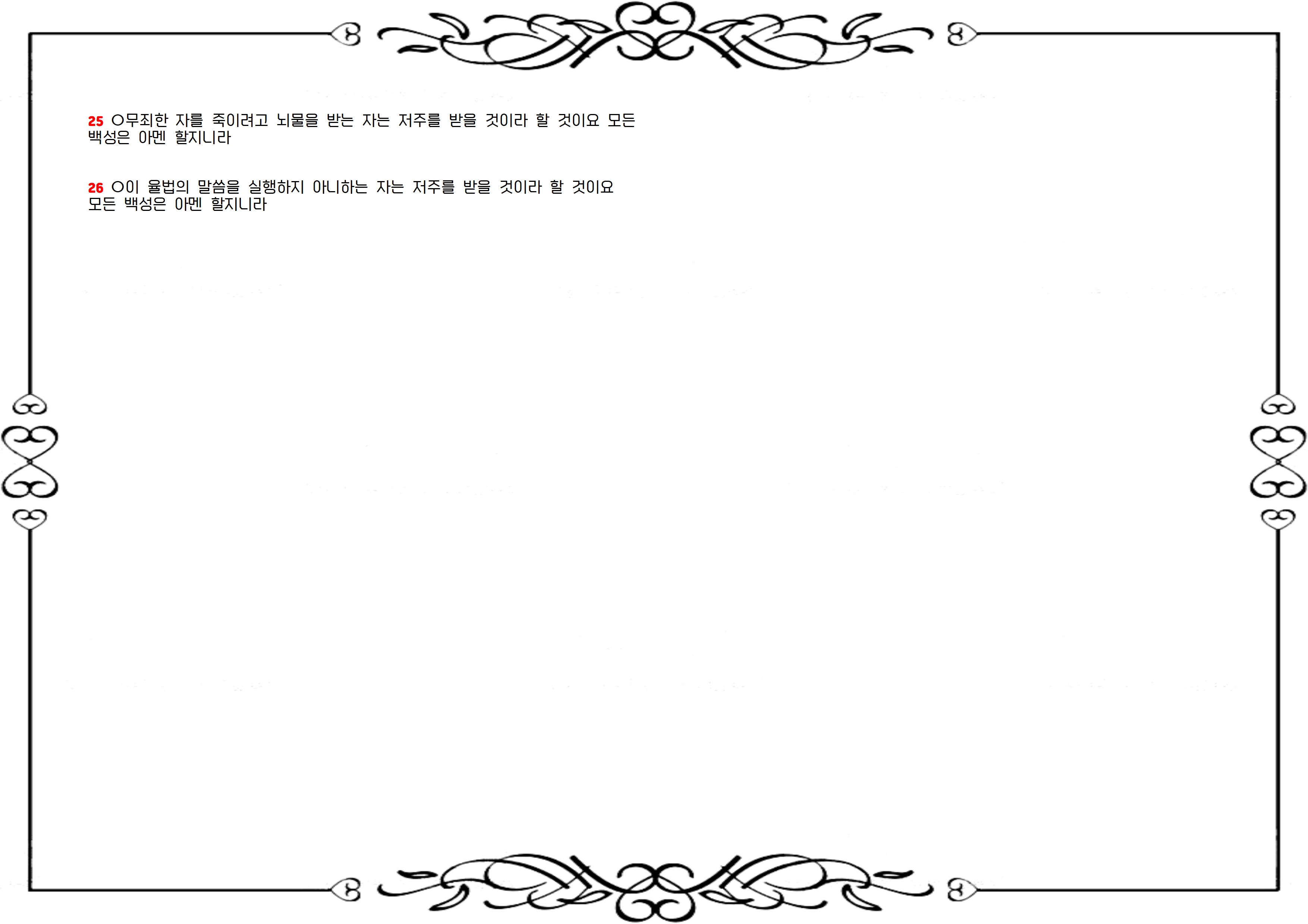 25 ○레위 사람: '죄 없는 사람을 죽이려고 뇌물을 받는 자는 저주를 받을 것이다.' 백성: '아멘!'
