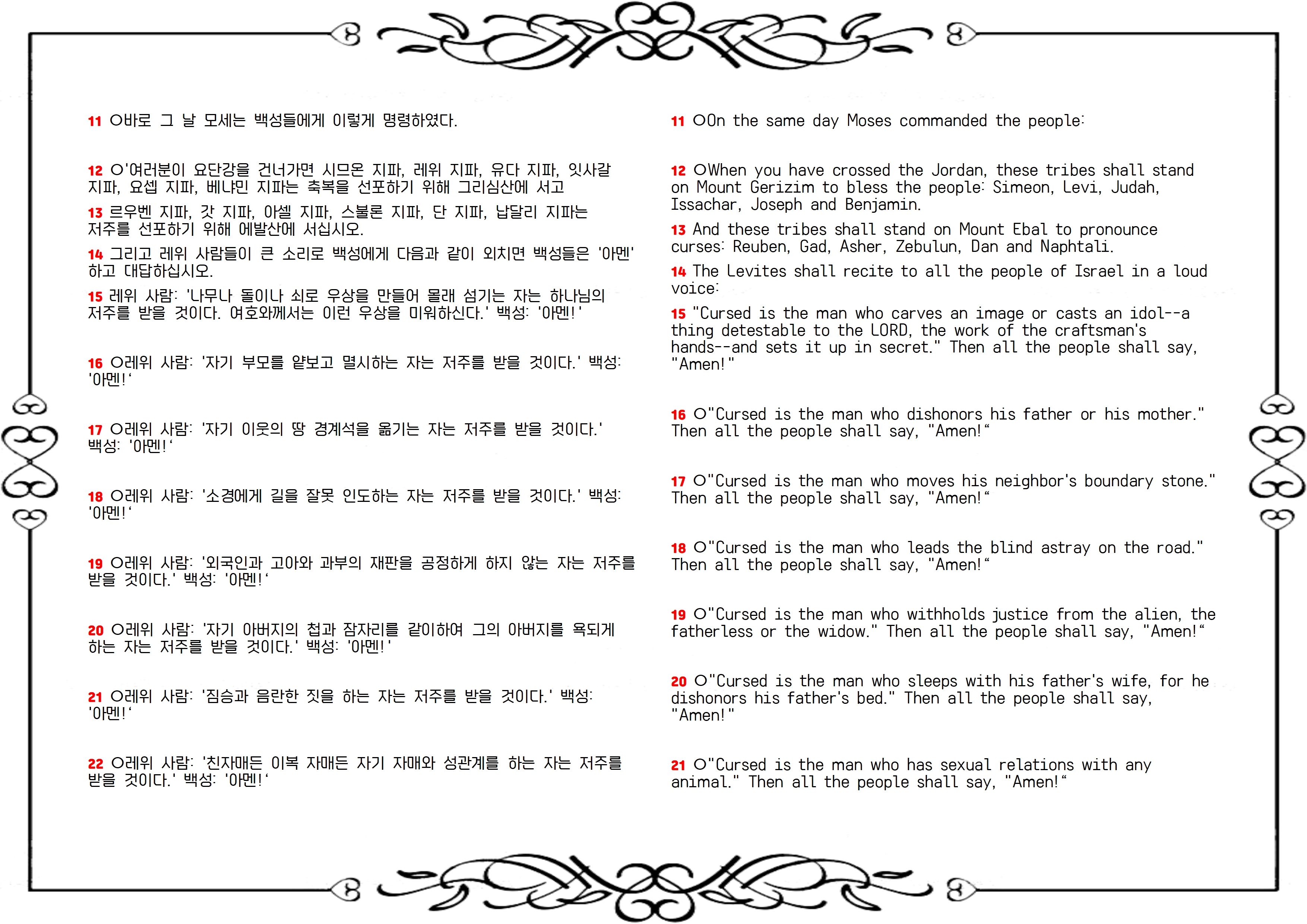레위 사람들이 열두 개의 언약 위반 사례를 크게 읽고 저주를 선포하면, 모든 백성은 아멘으로 동의해야 했습니다.