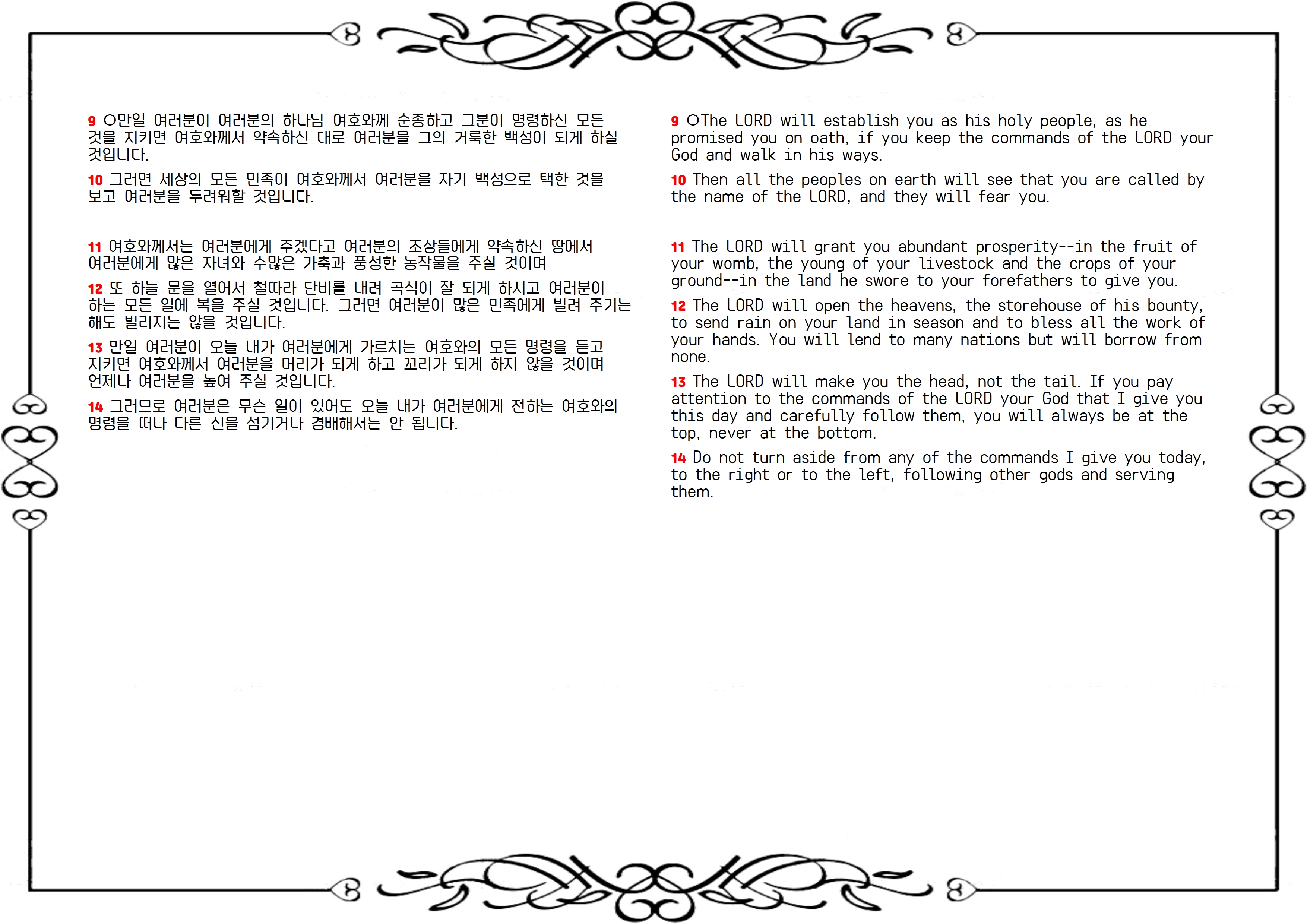 9 ○여호와께서 네게 맹세하신 대로 너를 세워 자기의 성민이 되게 하시리니 이는 네가 네 하나님 여호와의 명령을 지켜 그 길로 행할 것임이니라