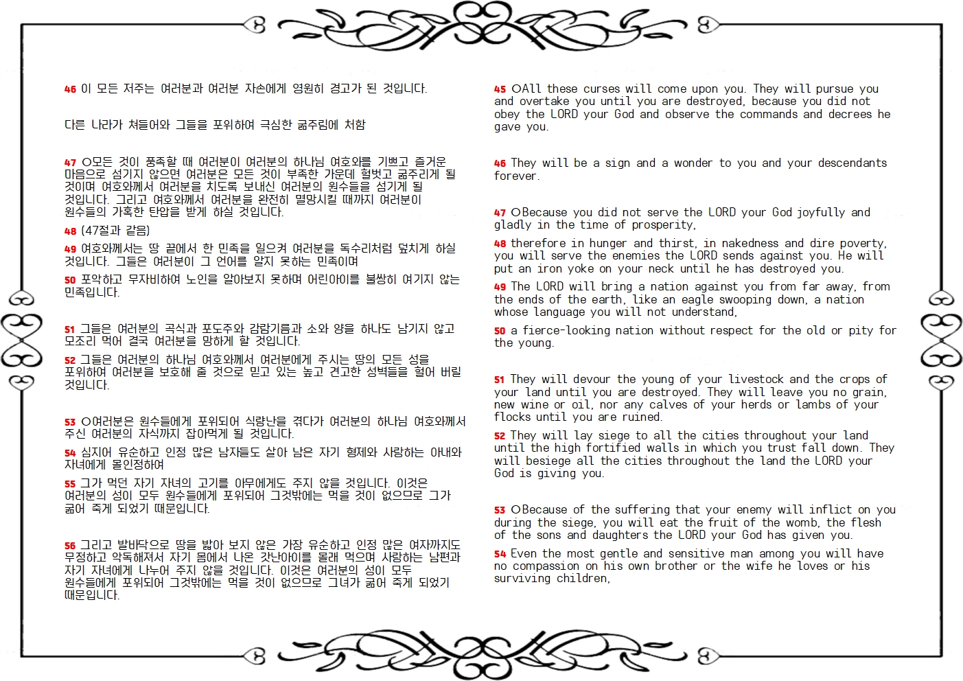 47 ○모든 것이 풍족할 때 여러분이 여러분의 하나님 여호와를 기쁘고 즐거운 마음으로 섬기지 않으면 여러분은 모든 것이 부족한 가운데 헐벗고 굶주리게 될 것이며 여호와께서 여러분을 치도록 보내신 여러분의 원수들을 섬기게 될 것입니다. 그리고 여호와께서 여러분을 완전히 멸망시킬 때까지 여러분이 원수들의 가혹한 탄압을 받게 하실 것입니다.