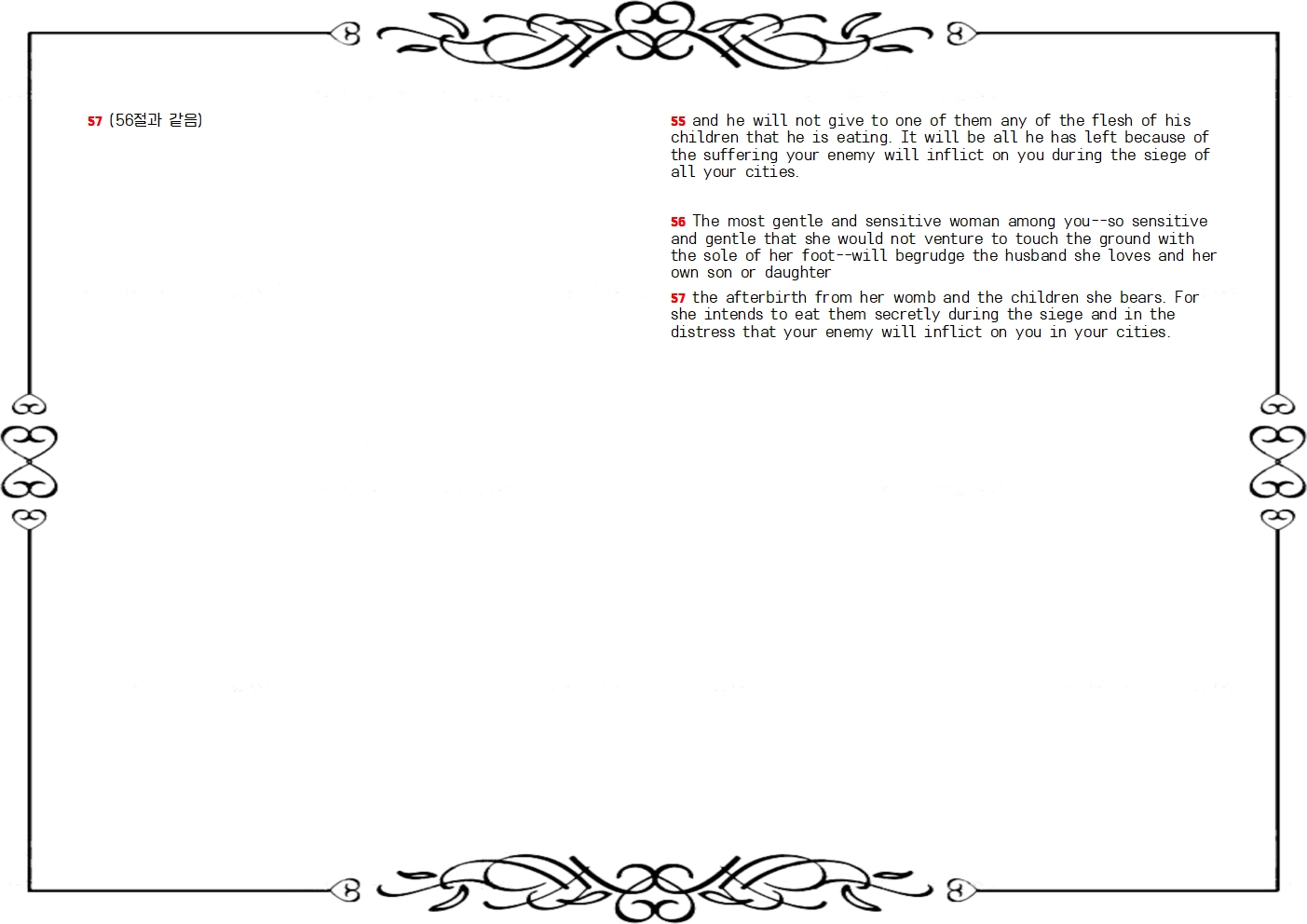 57 자기 다리 사이에서 나온 태와 자기가 낳은 어린 자식을 남몰래 먹으리니 이는 네 적군이 네 생명을 에워싸고 맹렬히 쳐서 곤란하게 하므로 아무것도 얻지 못함이리라