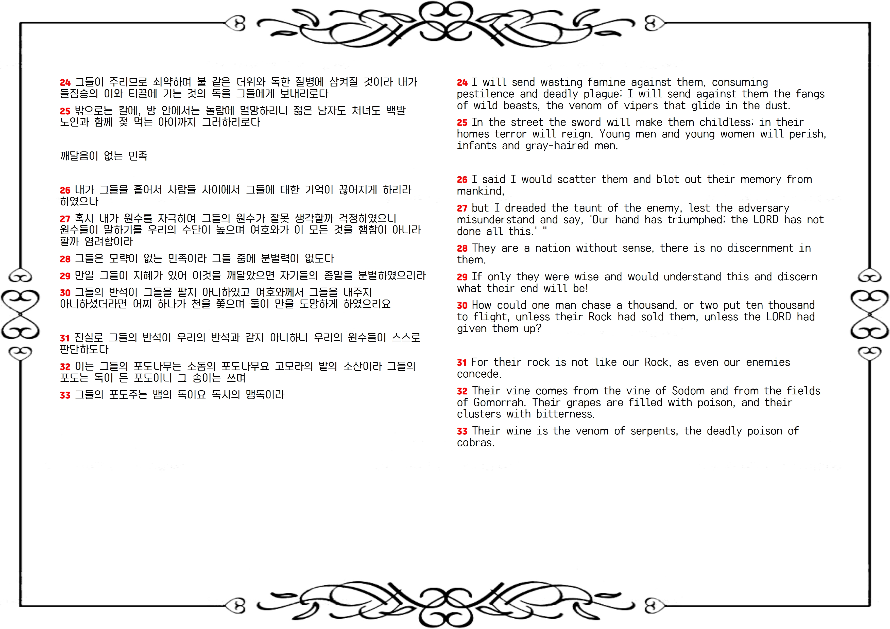 33 그들의 포도주는 뱀의 독이요 독사의 맹독이라
