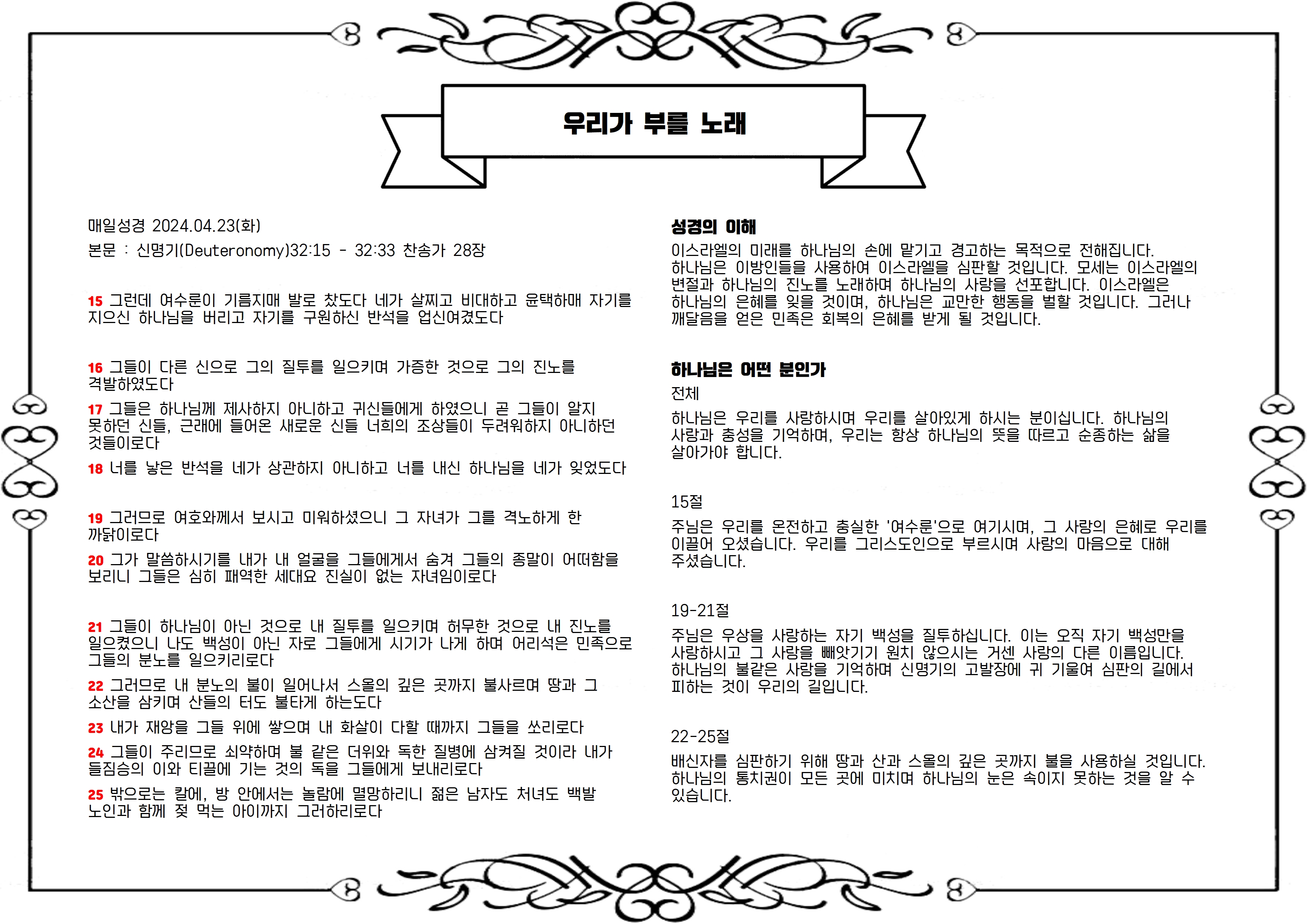 본문 : 신명기(Deuteronomy)32:15 - 32:33 찬송가 28장