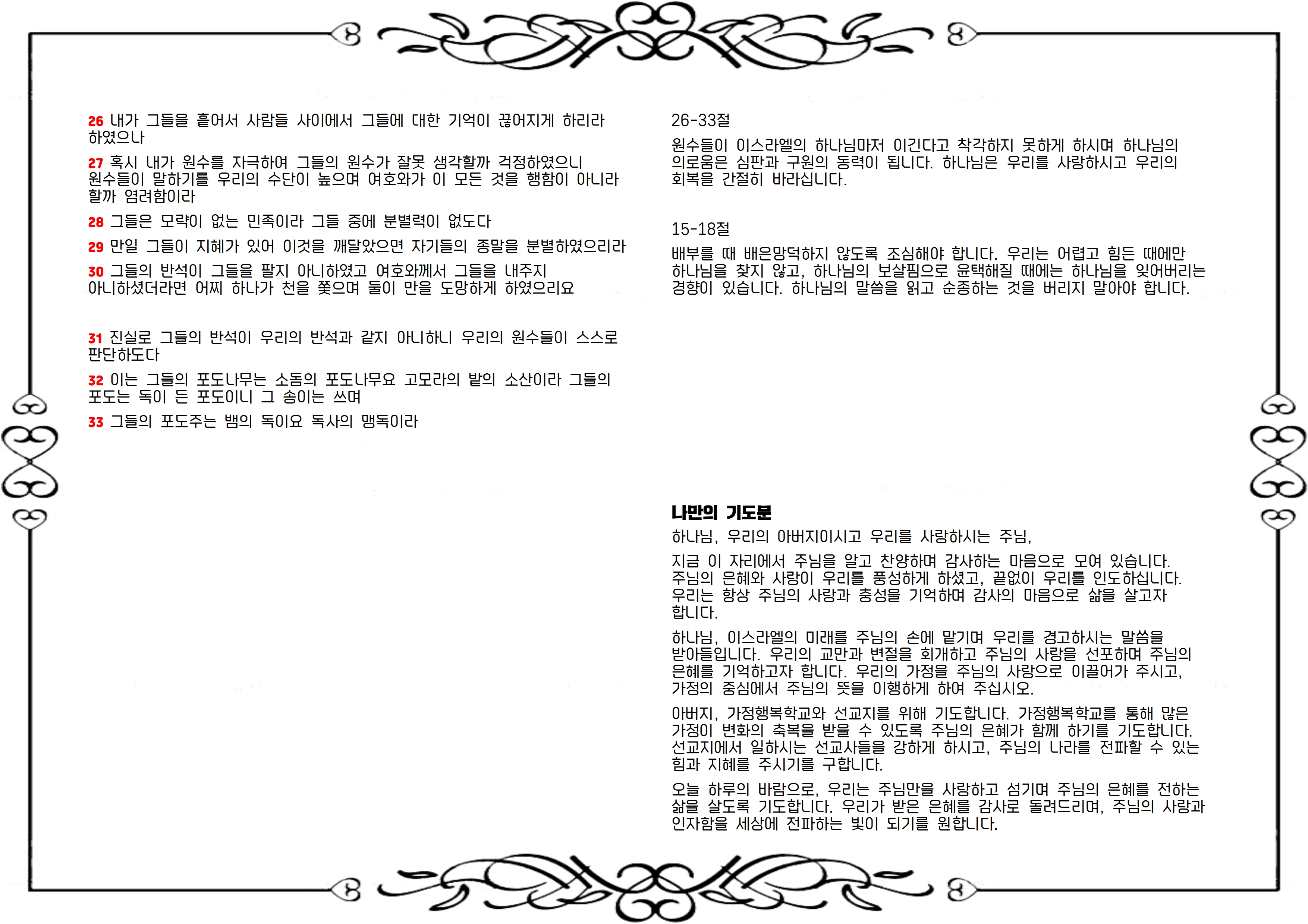 하나님, 이스라엘의 미래를 주님의 손에 맡기며 우리를 경고하시는 말씀을 받아들입니다. 우리의 교만과 변절을 회개하고 주님의 사랑을 선포하며 주님의 은혜를 기억하고자 합니다. 우리의 가정을 주님의 사랑으로 이끌어가 주시고, 가정의 중심에서 주님의 뜻을 이행하게 하여 주십시오.