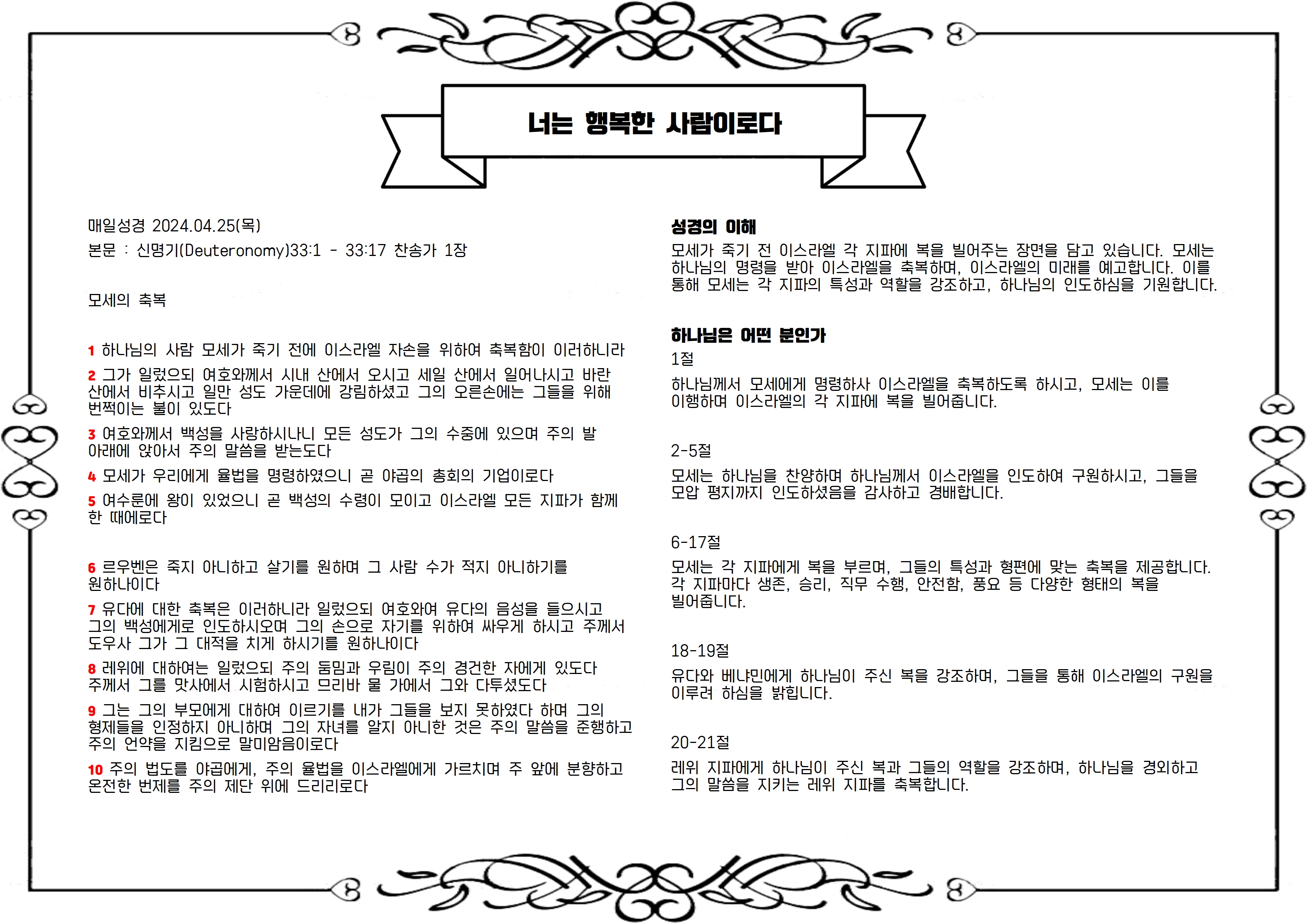 하늘에 계신 우리 아버지, 우리를 인도하시고 지키시며 주의 찬양을 노래하며 감사합니다. 오늘도 주님의 말씀을 통해 우리에게 복을 부으시고, 모세가 이스라엘을 축복하듯이 우리도 주님의 축복을 받을 수 있음을 믿습니다. 우리를 가족의 중심으로 세우시고, 가정을 주의 사랑으로 이끌어 주시는 남편과 아버지의 역할을 강조합니다. 가정행복학교와 선교사들에게 주님의 복과 지혜를 충만히 주시며, 사랑으로 이웃을 섬기며 주님의 나라를 널리 전파할 수 있기를 기도합니다. 우리의 모든 바람을 주님께 바치며, 주님의 뜻을 향해 오늘 하루를 걸어가게 하소서.