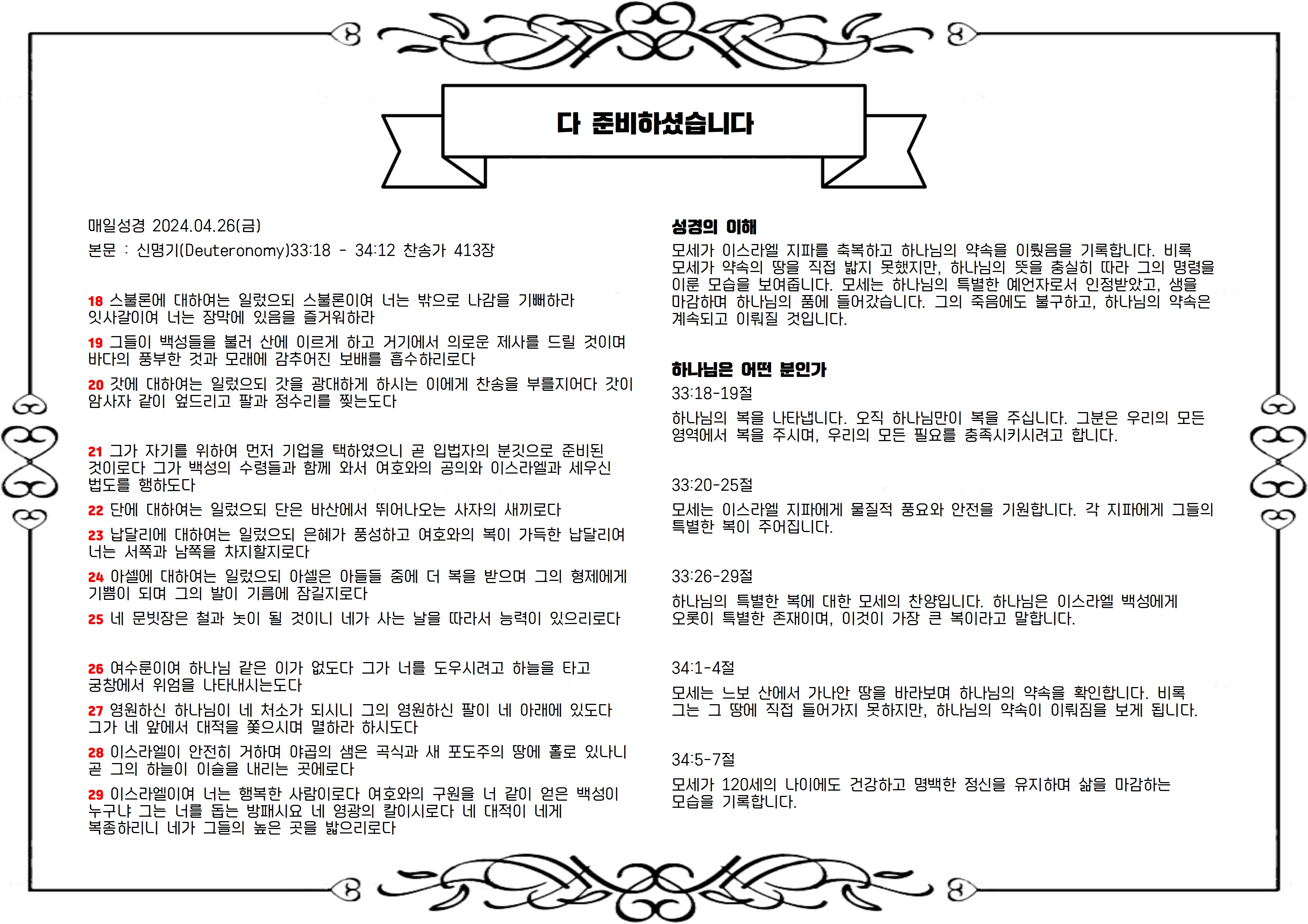 본문 : 신명기(Deuteronomy)33:18 - 34:12 찬송가 413장