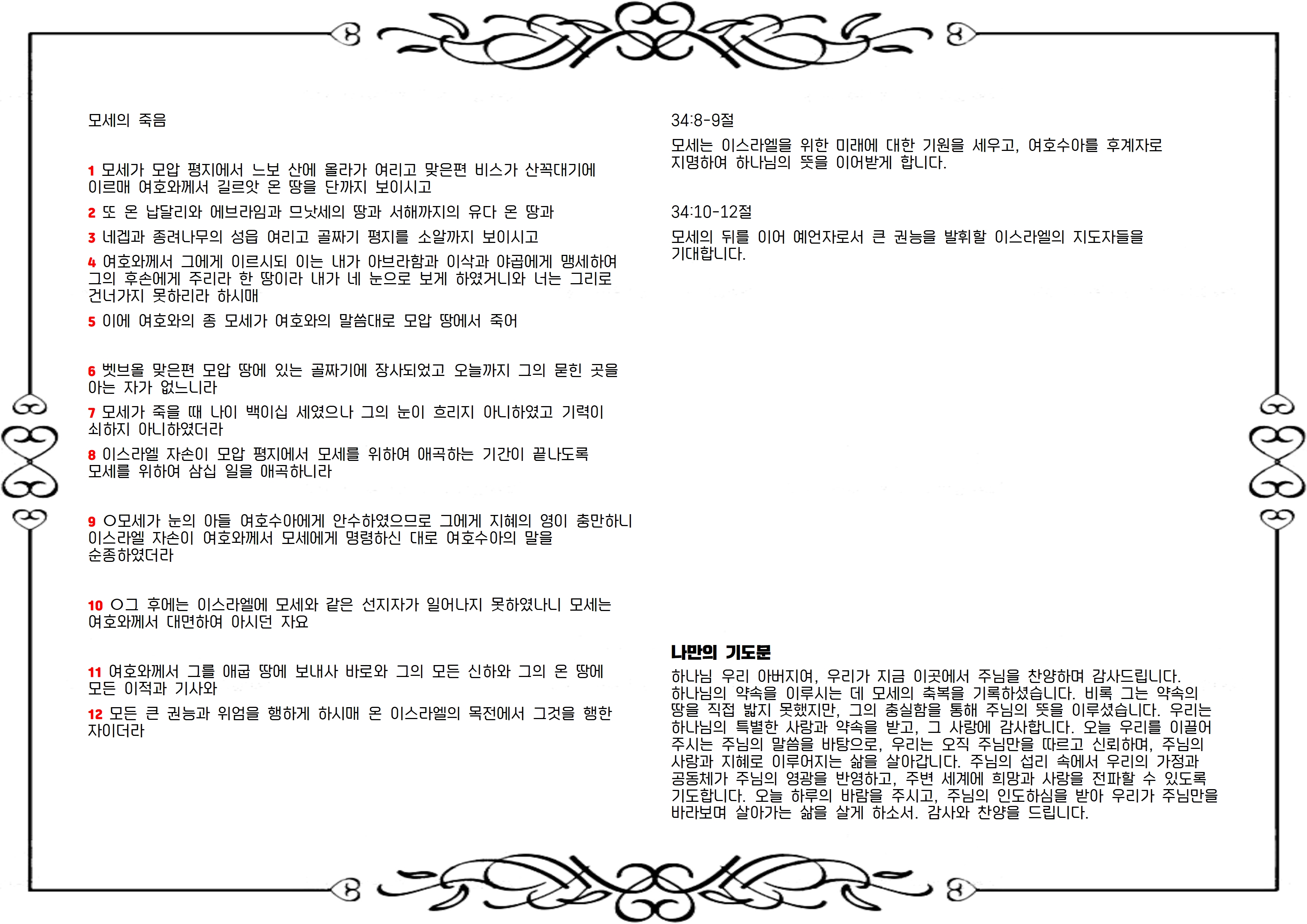 하나님 우리 아버지여, 우리가 지금 이곳에서 주님을 찬양하며 감사드립니다. 하나님의 약속을 이루시는 데 모세의 축복을 기록하셨습니다. 비록 그는 약속의 땅을 직접 밟지 못했지만, 그의 충실함을 통해 주님의 뜻을 이루셨습니다. 우리는 하나님의 특별한 사랑과 약속을 받고, 그 사랑에 감사합니다. 오늘 우리를 이끌어 주시는 주님의 말씀을 바탕으로, 우리는 오직 주님만을 따르고 신뢰하며, 주님의 사랑과 지혜로 이루어지는 삶을 살아갑니다. 주님의 섭리 속에서 우리의 가정과 공동체가 주님의 영광을 반영하고, 주변 세계에 희망과 사랑을 전파할 수 있도록 기도합니다. 오늘 하루의 바람을 주시고, 주님의 인도하심을 받아 우리가 주님만을 바라보며 살아가는 삶을 살게 하소서. 감사와 찬양을 드립니다.