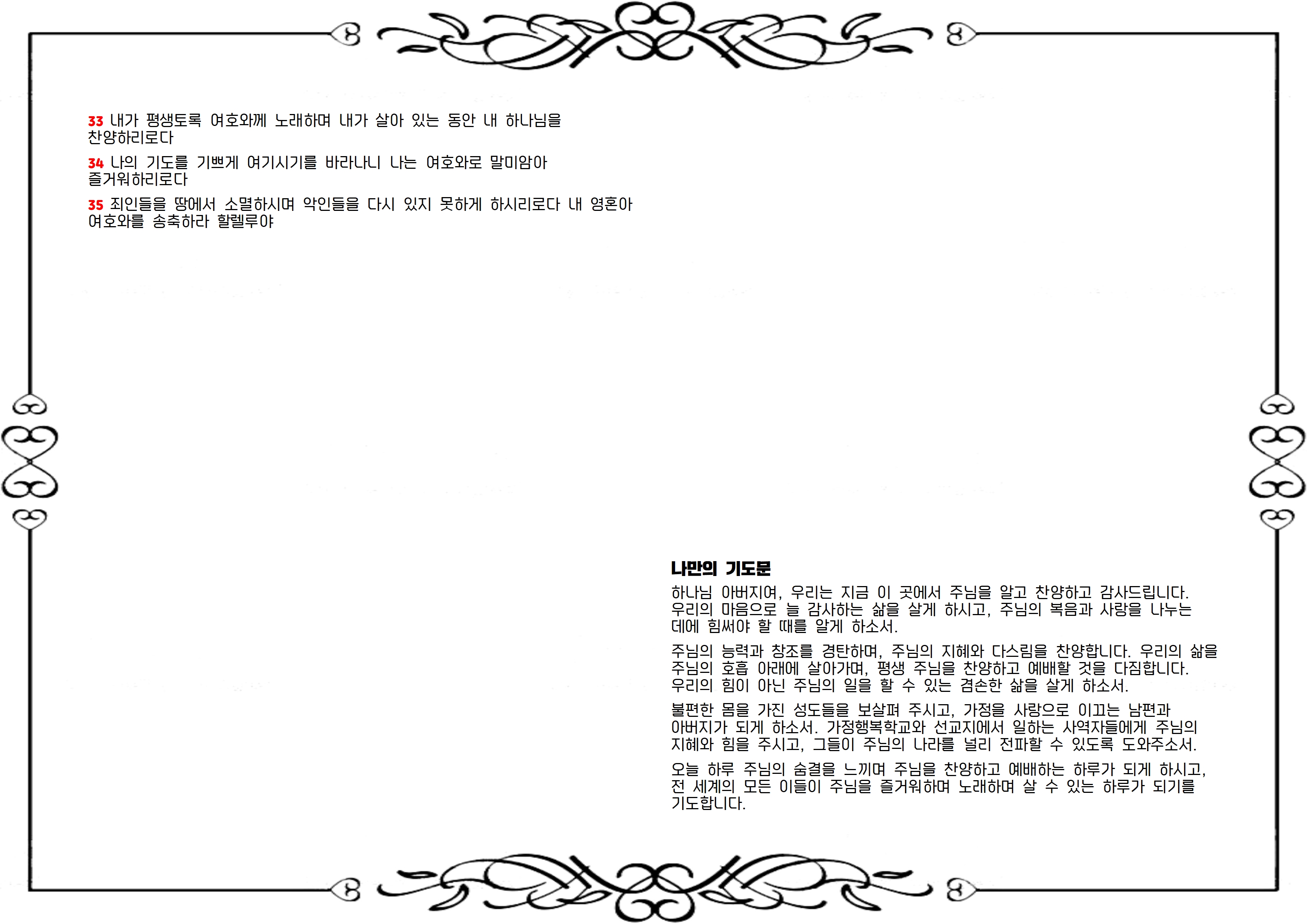 주님의 능력과 창조를 경탄하며, 주님의 지혜와 다스림을 찬양합니다. 우리의 삶을 주님의 호흡 아래에 살아가며, 평생 주님을 찬양하고 예배할 것을 다짐합니다. 우리의 힘이 아닌 주님의 일을 할 수 있는 겸손한 삶을 살게 하소서.