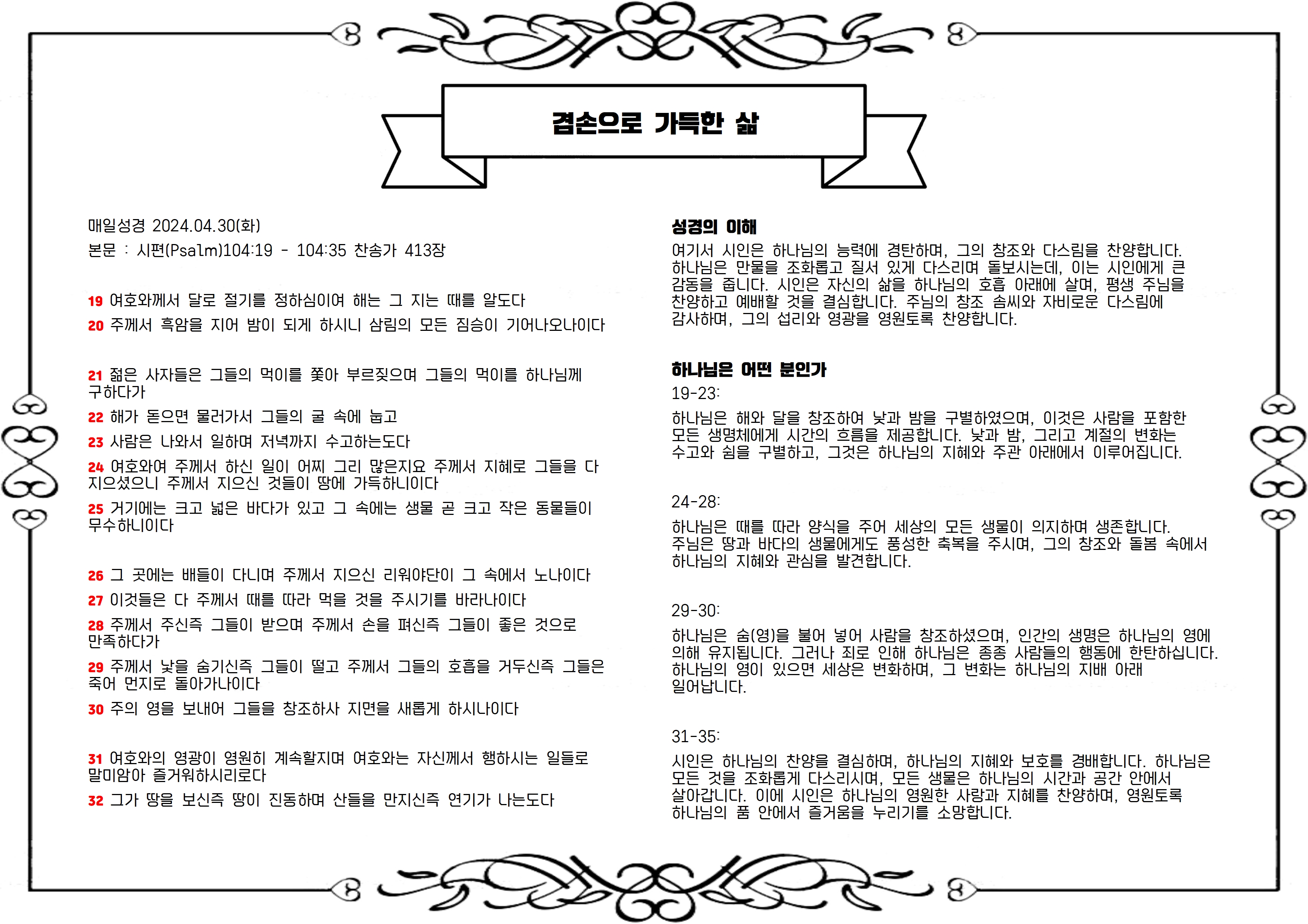 본문 : 시편(Psalm)104:19 - 104:35 찬송가 413장