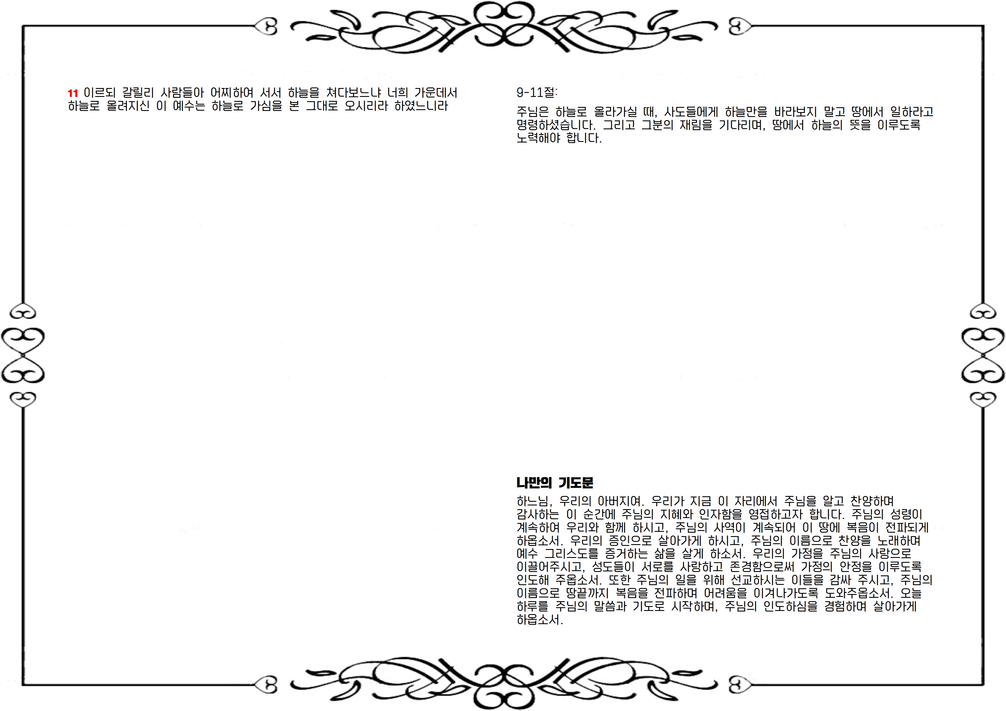 하느님, 우리의 아버지여. 우리가 지금 이 자리에서 주님을 알고 찬양하며 감사하는 이 순간에 주님의 지혜와 인자함을 영접하고자 합니다. 주님의 성령이 계속하여 우리와 함께 하시고, 주님의 사역이 계속되어 이 땅에 복음이 전파되게 하옵소서. 우리의 증인으로 살아가게 하시고, 주님의 이름으로 찬양을 노래하며 예수 그리스도를 증거하는 삶을 살게 하소서. 우리의 가정을 주님의 사랑으로 이끌어주시고, 성도들이 서로를 사랑하고 존경함으로써 가정의 안정을 이루도록 인도해 주옵소서. 또한 주님의 일을 위해 선교하시는 이들을 감싸 주시고, 주님의 이름으로 땅끝까지 복음을 전파하며 어려움을 이겨나가도록 도와주옵소서. 오늘 하루를 주님의 말씀과 기도로 시작하며, 주님의 인도하심을 경험하며 살아가게 하옵소서.