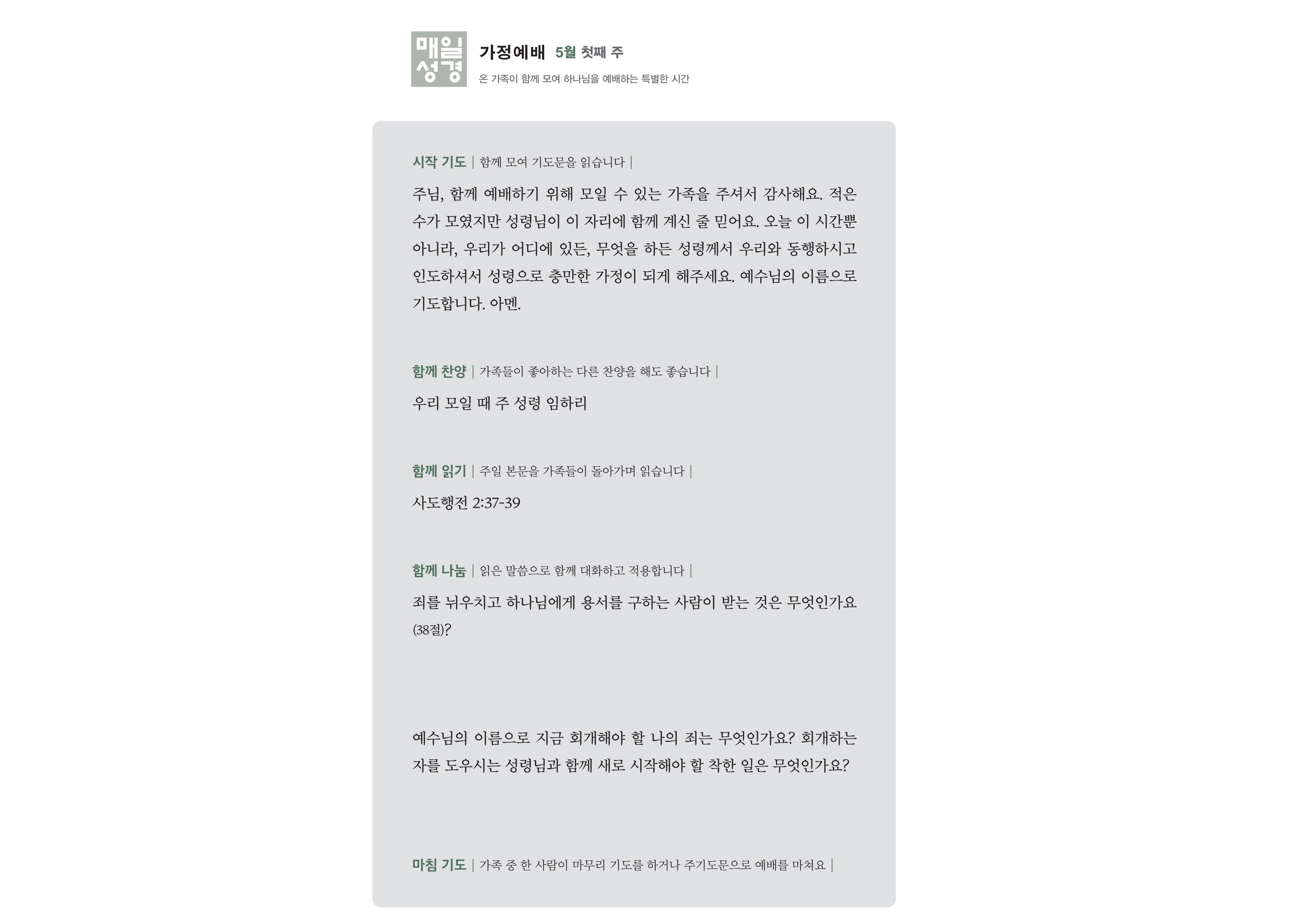 하늘에 계신 우리 아버지, 주님의 이름을 찬양하며 감사드립니다. 베드로의 설교를 통해 많은 이들이 회개하고 새로운 공동체를 형성하였습니다. 우리 모두가 서로 사랑으로 이끄는 가정을 이루며, 모든 이들이 주님을 알아가고 찬양할 수 있도록 기도합니다. 주님의 은혜를 경험하며 변화되는 가정행복학교와 선교사들을 위하여도 우리의 기도를 들어주소서. 우리의 모든 행동과 생각이 주님의 뜻을 이루며 세상에 밝은 빛이 되도록 도와주소서. 주님의 사랑으로 우리를 이끄시고, 세상에 대안적인 삶과 사랑을 전하는 교회로 사용하시옵소서.