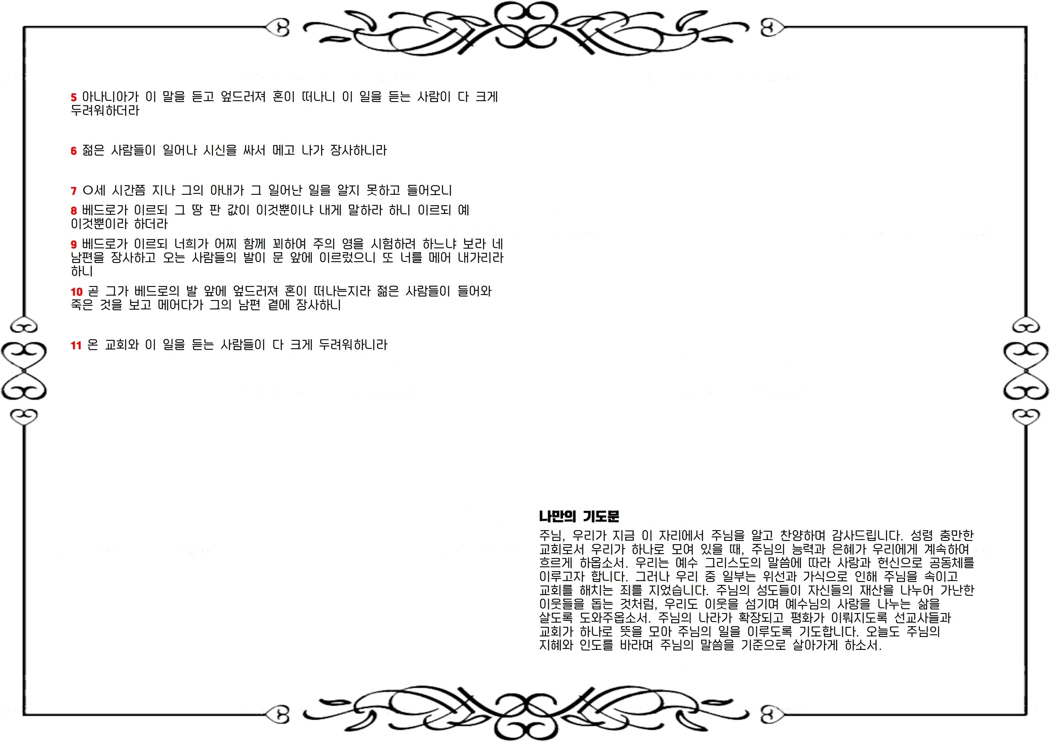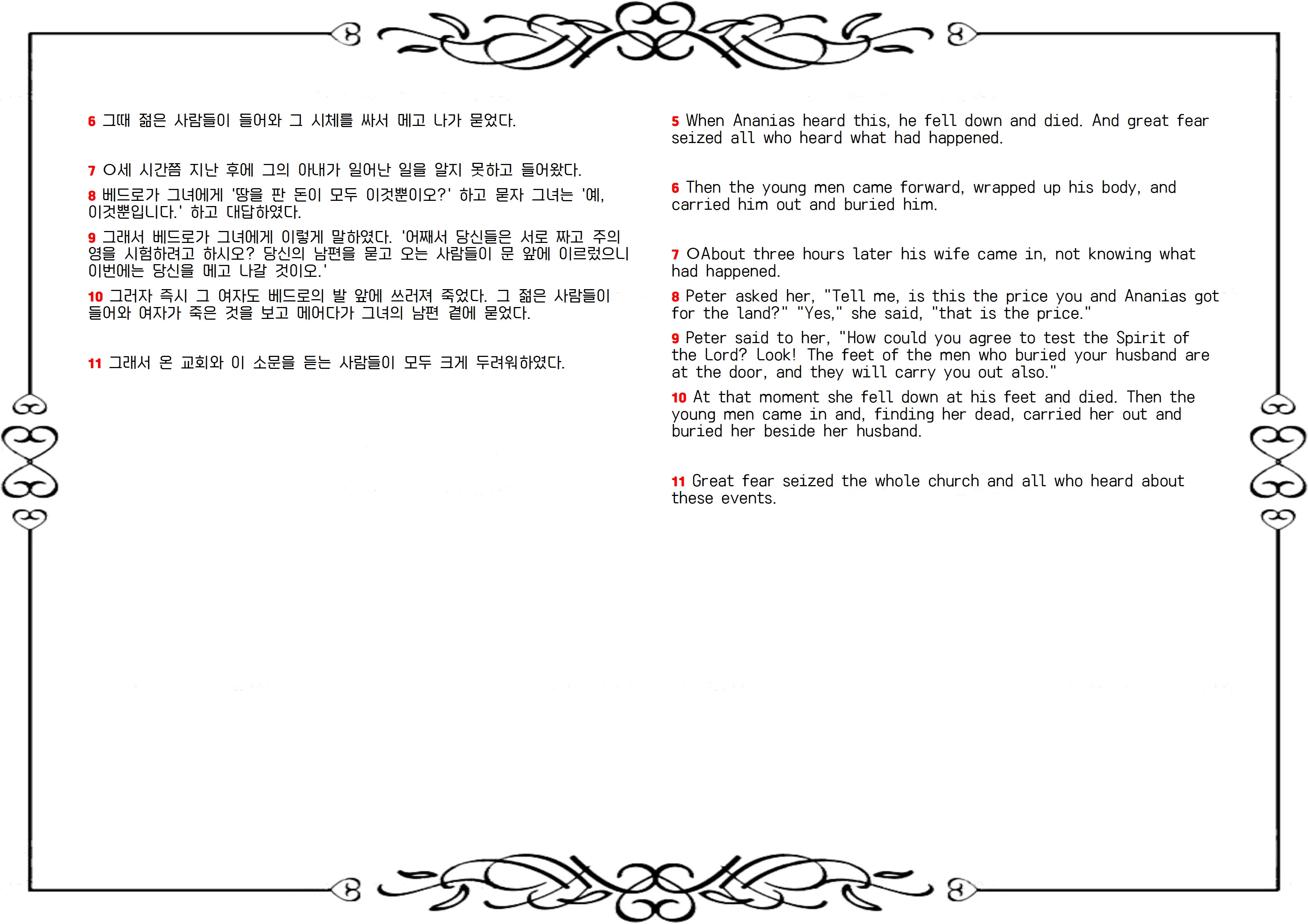 5 아나니아가 이 말을 듣고 엎드러져 혼이 떠나니 이 일을 듣는 사람이 다 크게 두려워하더라