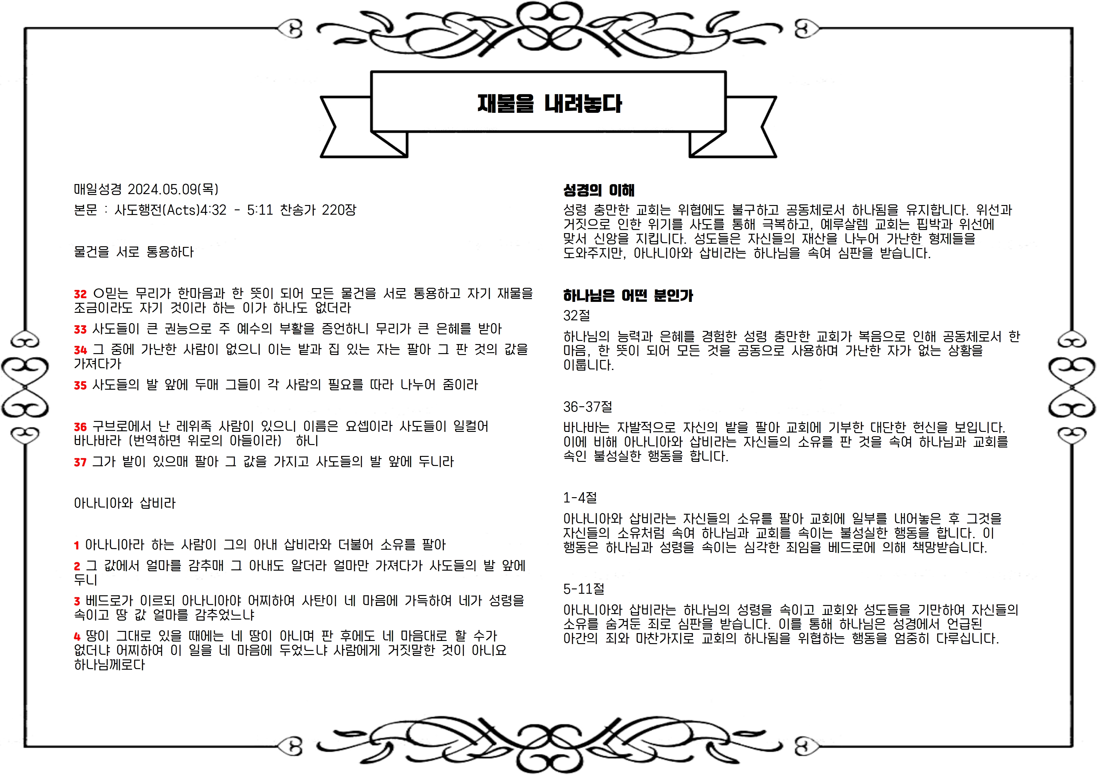 본문 : 사도행전(Acts)4:32 - 5:11 찬송가 220장
