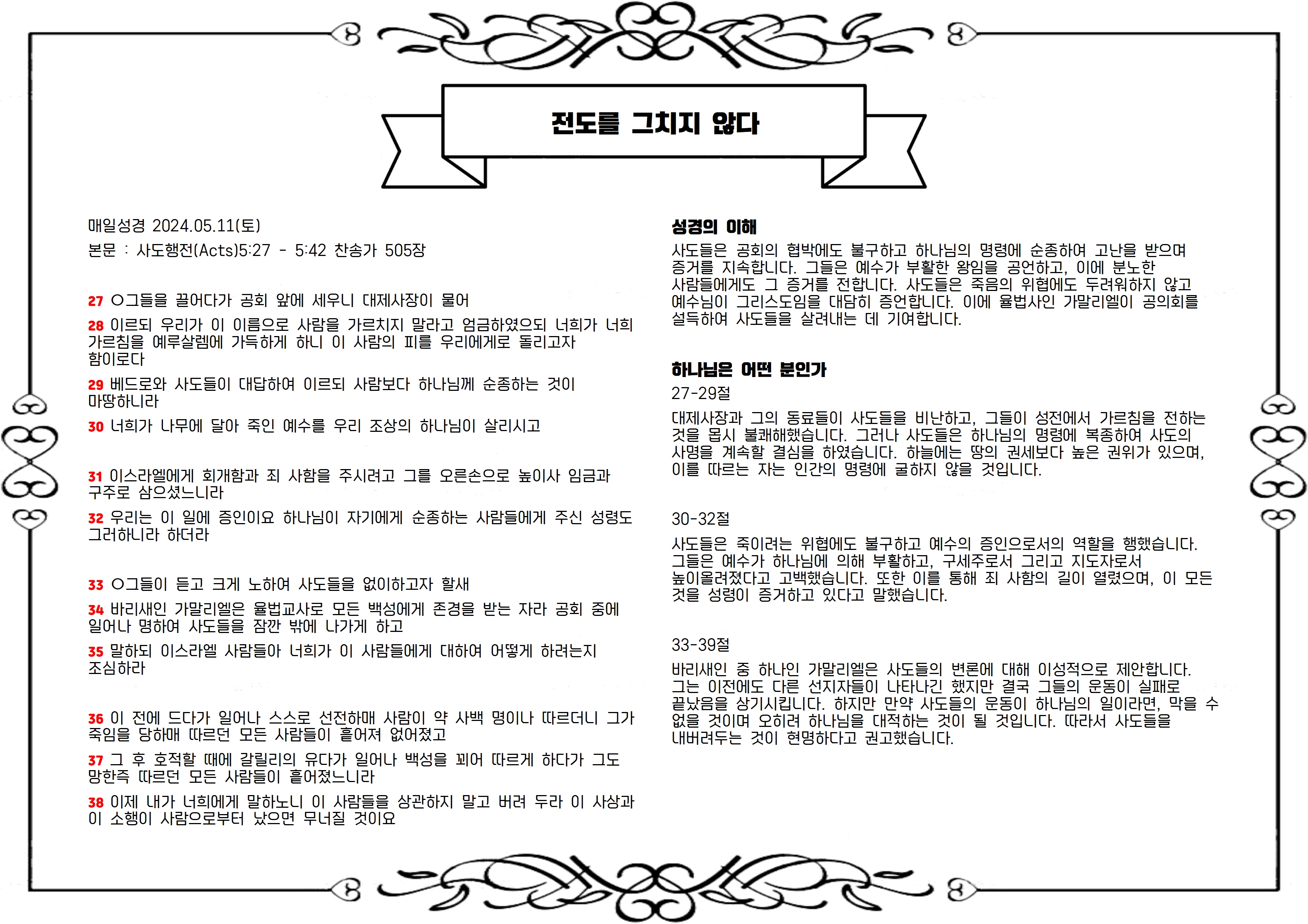 본문 : 사도행전(Acts)5:27 - 5:42 찬송가 505장