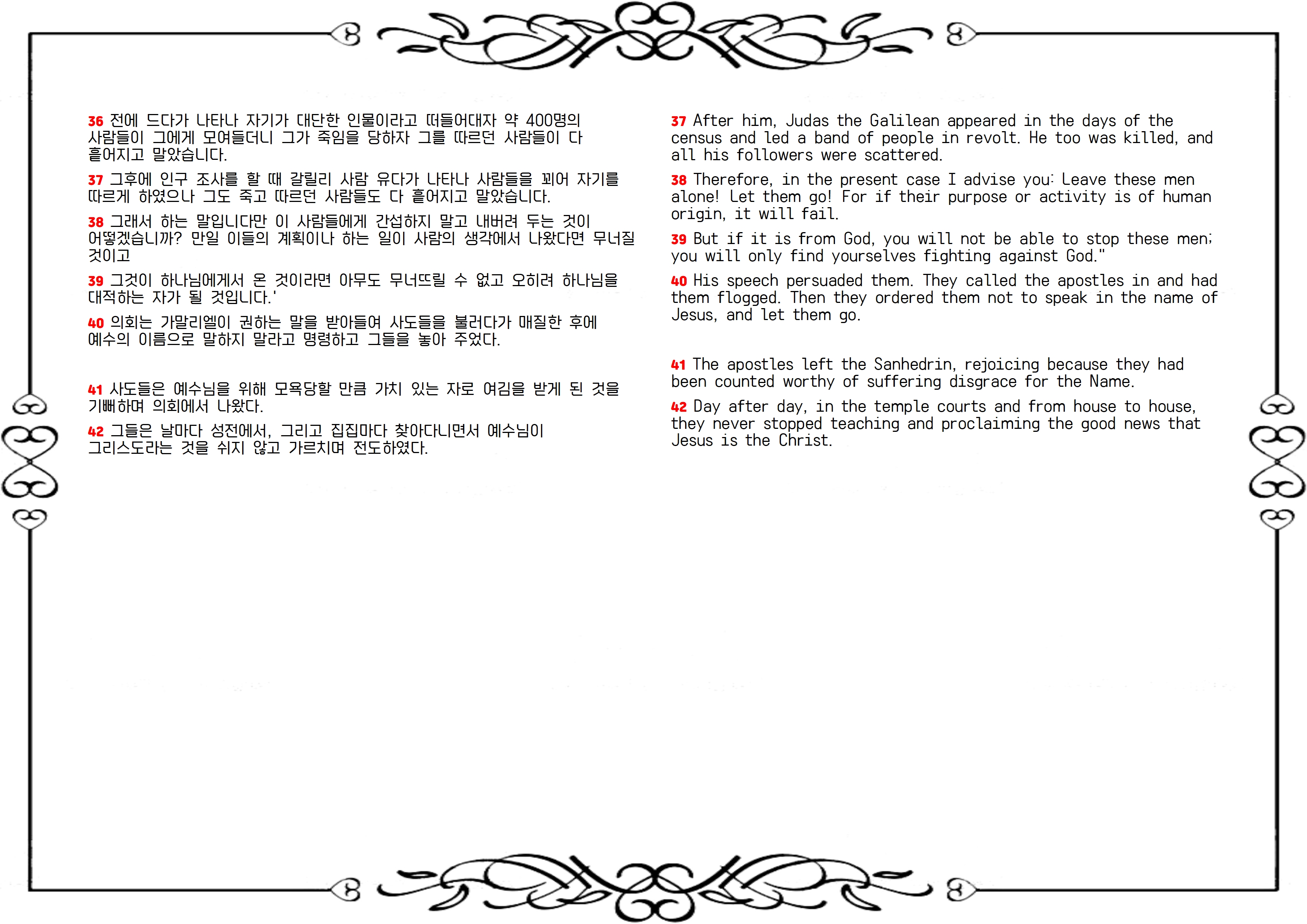40 의회는 가말리엘이 권하는 말을 받아들여 사도들을 불러다가 매질한 후에 예수의 이름으로 말하지 말라고 명령하고 그들을 놓아 주었다.