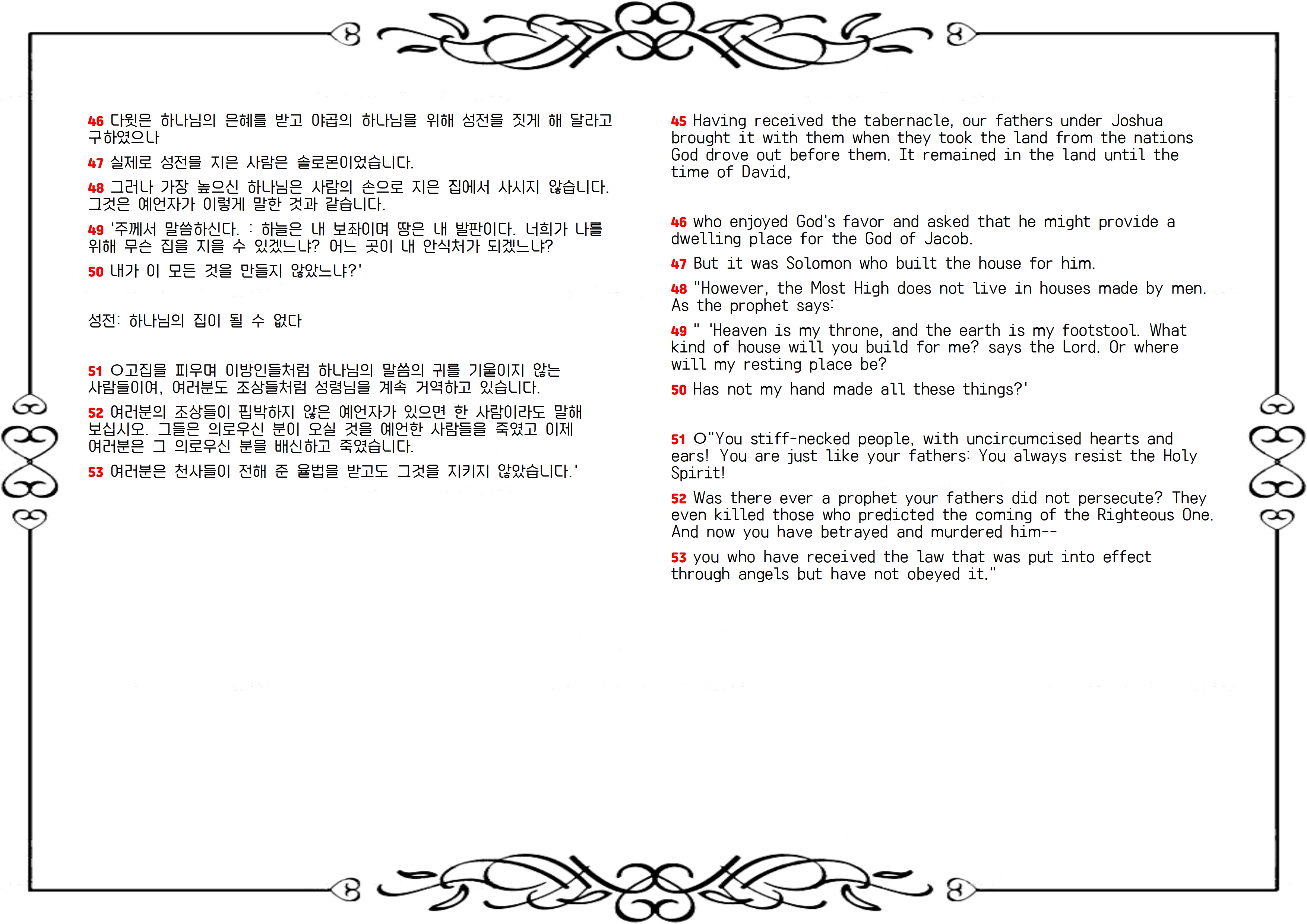 51 ○목이 곧고 마음과 귀에 할례를 받지 못한 사람들아 너희도 너희 조상과 같이 항상 성령을 거스르는도다