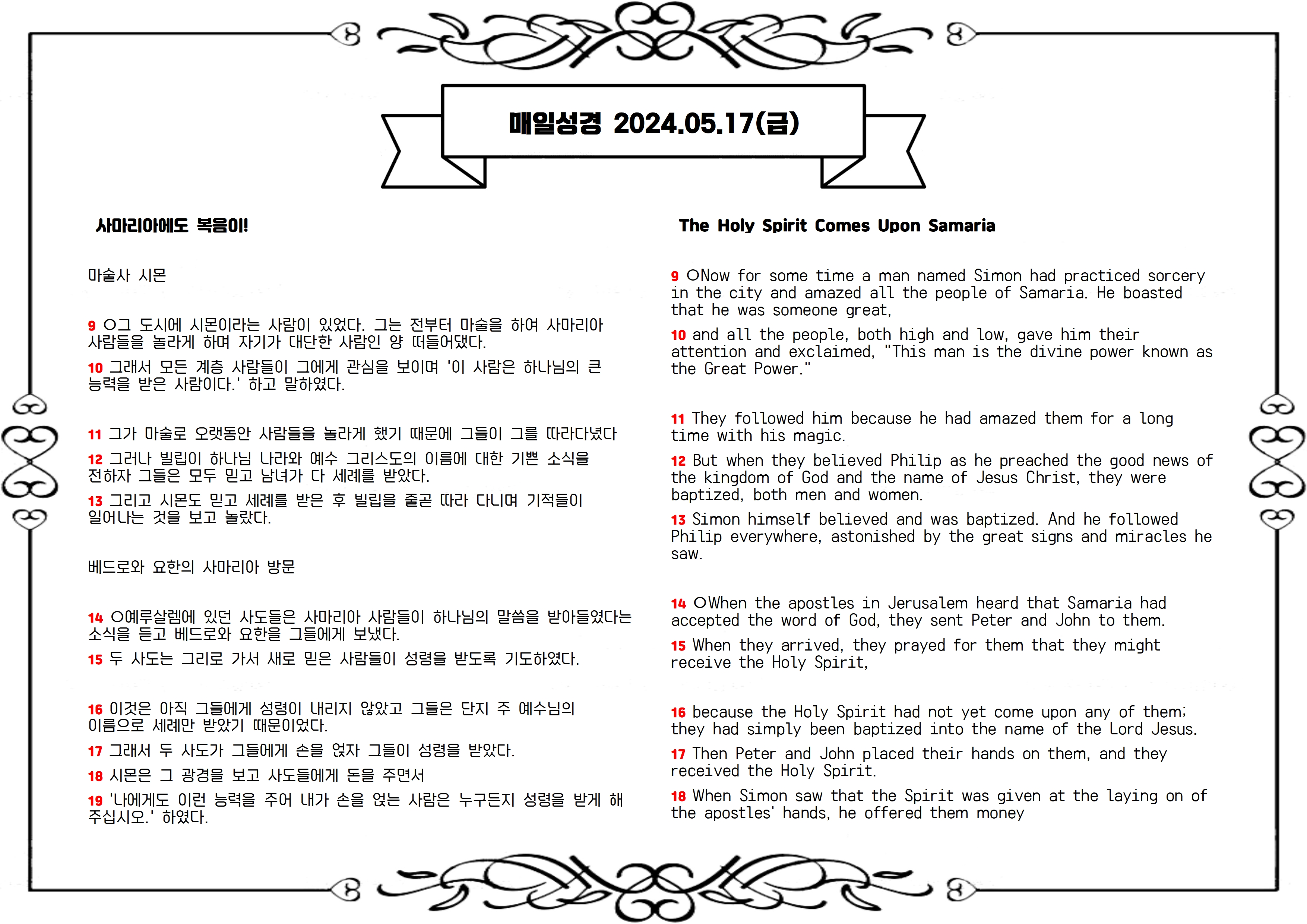 하나님의 말씀을 통해 우리에게 전하신 사마리아에서의 복음 전파와 성령의 역사를 기억하며 주님 앞에서 기도합니다. 마술사 시몬의 잘못된 욕심과 베드로와 요한의 질책을 통해 우리의 마음을 깨우치게 하소서. 성령이 사마리아에 임하시고 복음이 전해짐으로써 우리에게도 주님의 영광이 나타나게 하소서.