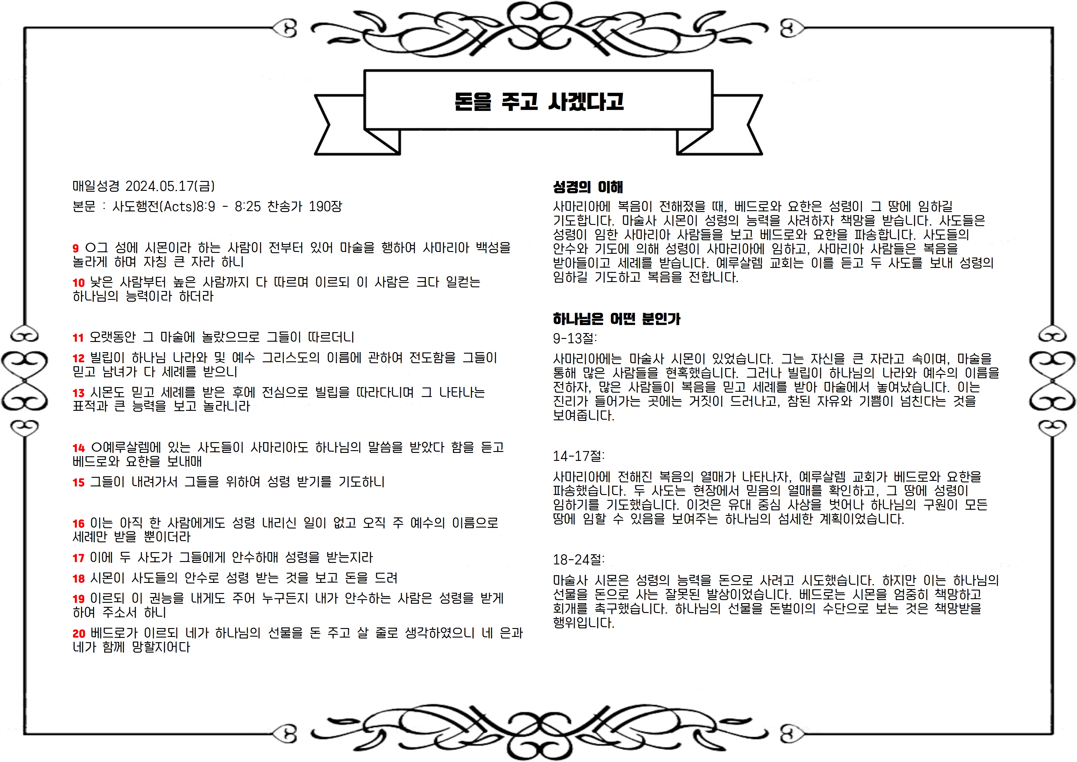 본문 : 사도행전(Acts)8:9 - 8:25 찬송가 190장