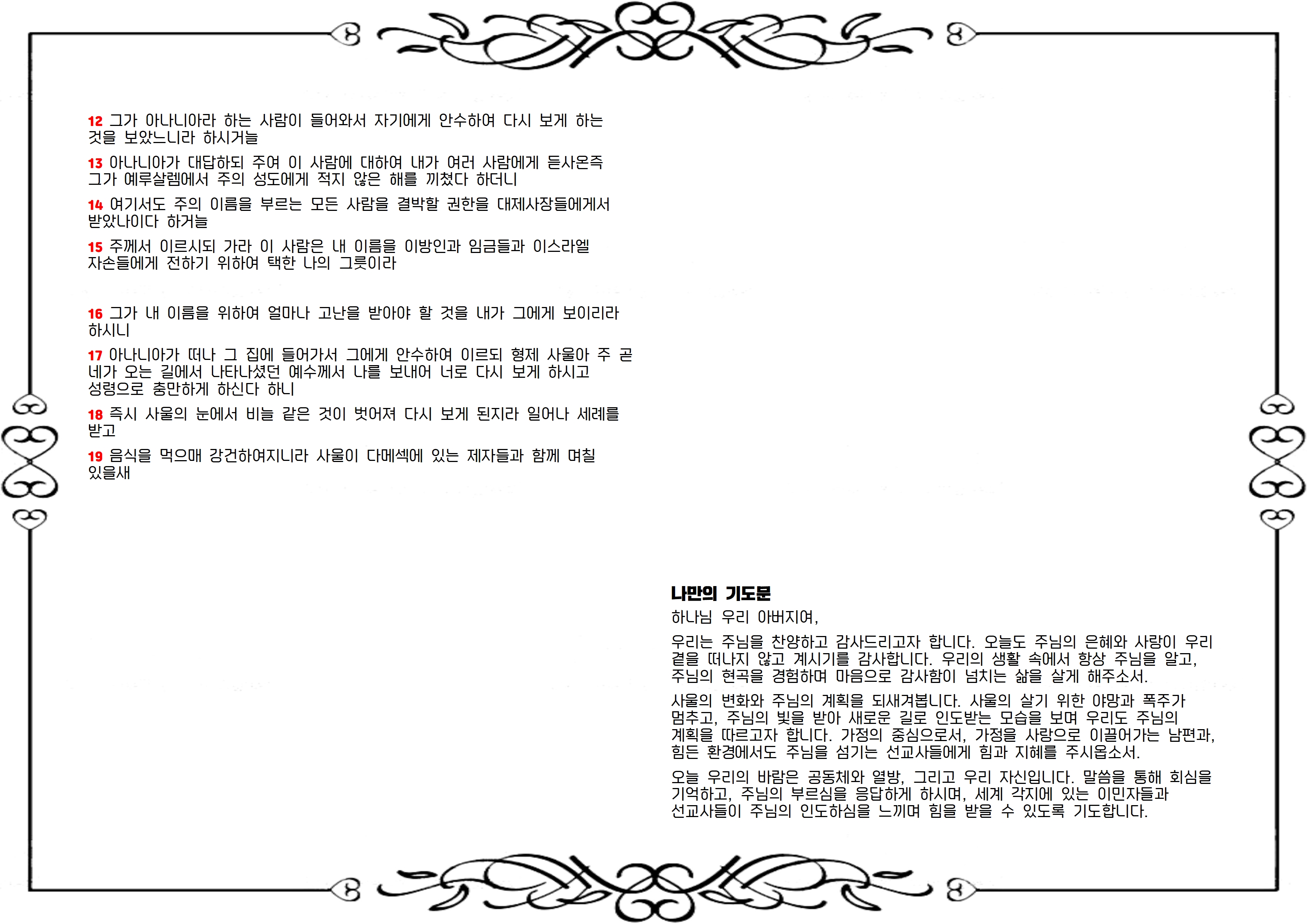 사울의 변화와 주님의 계획을 되새겨봅니다. 사울의 살기 위한 야망과 폭주가 멈추고, 주님의 빛을 받아 새로운 길로 인도받는 모습을 보며 우리도 주님의 계획을 따르고자 합니다. 가정의 중심으로서, 가정을 사랑으로 이끌어가는 남편과, 힘든 환경에서도 주님을 섬기는 선교사들에게 힘과 지혜를 주시옵소서.