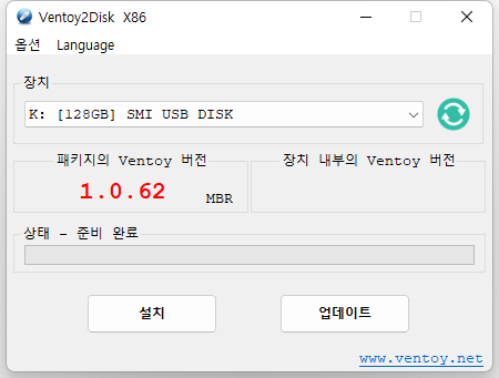 3. Ventoy2Disk.exe를 실행하여 올바른 USB 드라이브를 장치를 선택하고 설치 또는 업데이트 버튼을 클릭합니다.