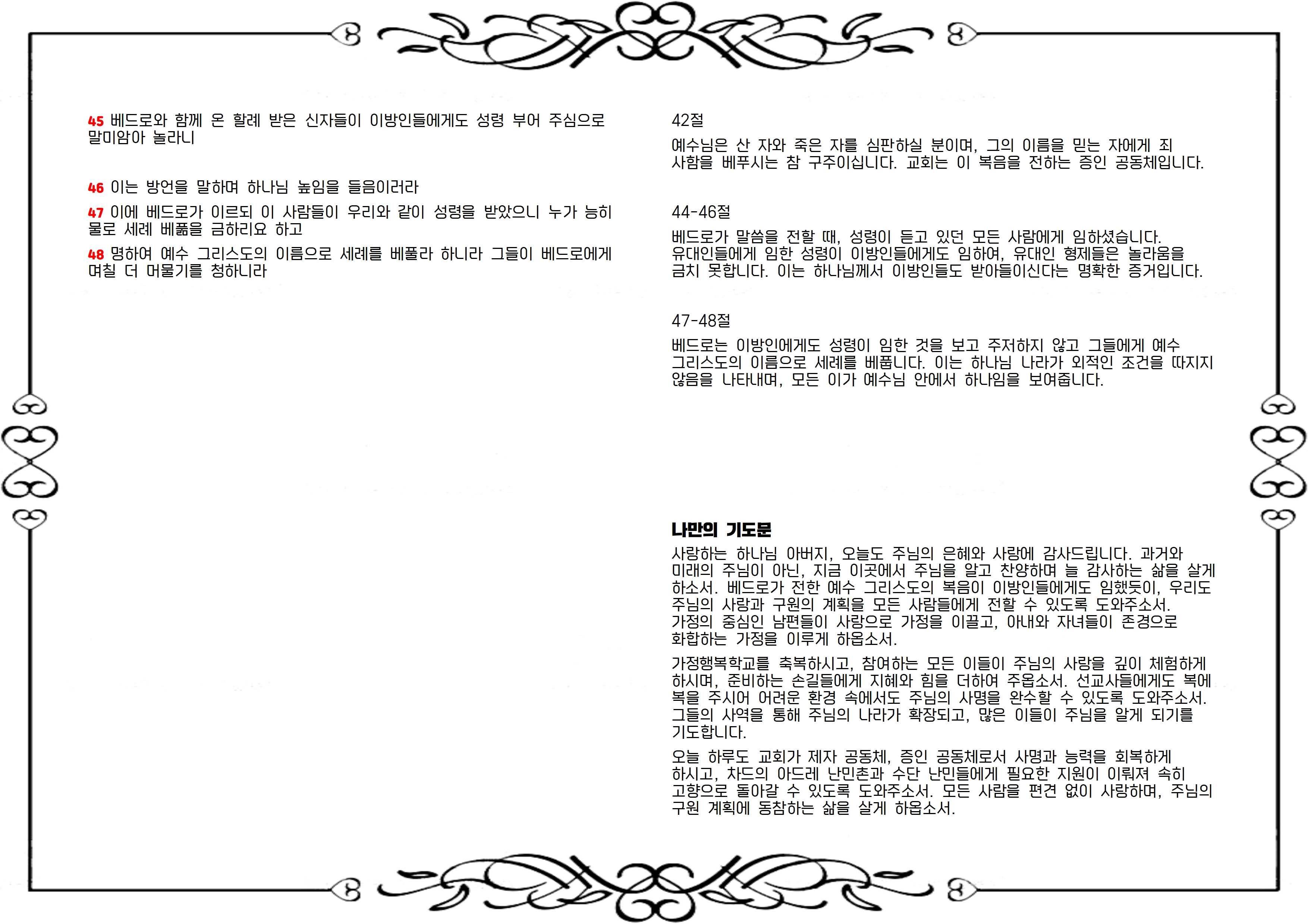 사랑하는 하나님 아버지, 오늘도 주님의 은혜와 사랑에 감사드립니다. 과거와 미래의 주님이 아닌, 지금 이곳에서 주님을 알고 찬양하며 늘 감사하는 삶을 살게 하소서. 베드로가 전한 예수 그리스도의 복음이 이방인들에게도 임했듯이, 우리도 주님의 사랑과 구원의 계획을 모든 사람들에게 전할 수 있도록 도와주소서. 가정의 중심인 남편들이 사랑으로 가정을 이끌고, 아내와 자녀들이 존경으로 화합하는 가정을 이루게 하옵소서.